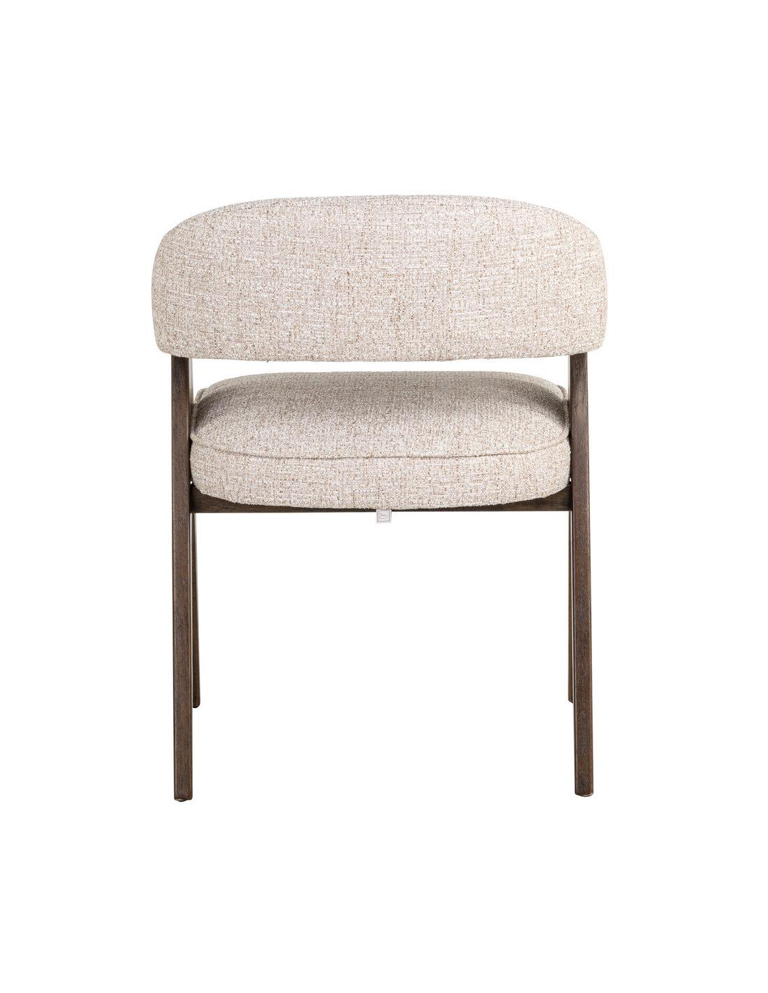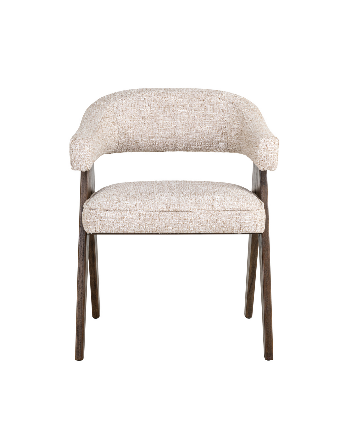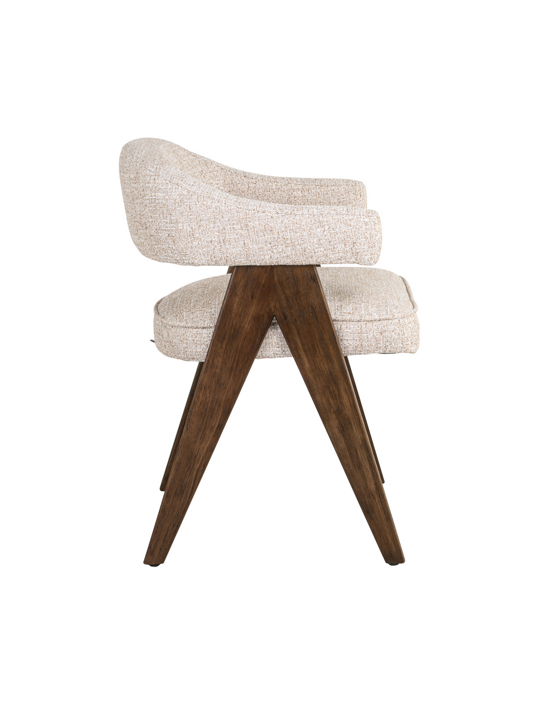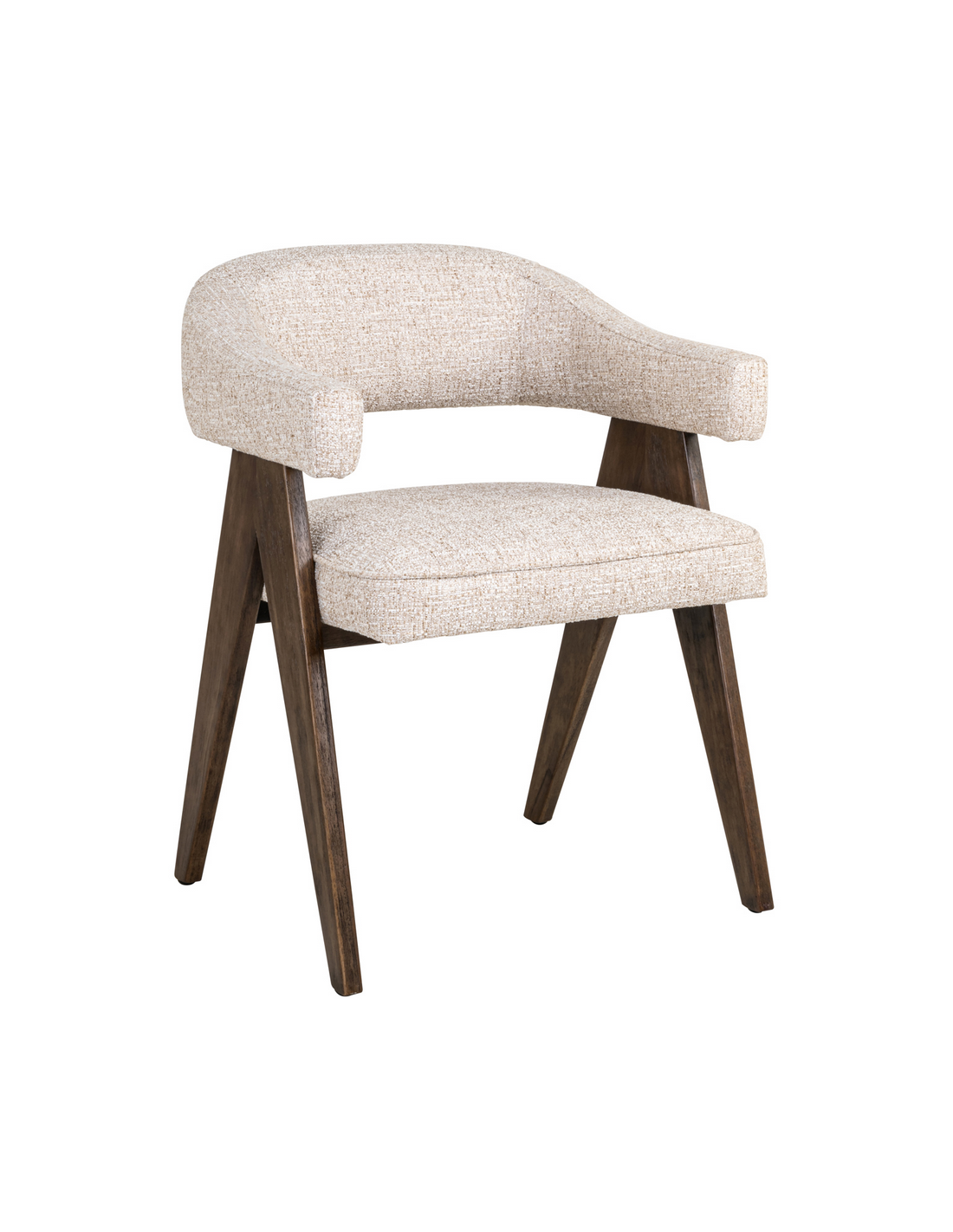 MORI Spisebordsstol med armlæn, udført i et design fra hollandske Richmond Interiors, fremstillet i brunlakeret fyrretræ og cremefarvet tweed. Stolen måler 79 cm i højden over ryggen og 63 x 59 cm i bredde og dybde.