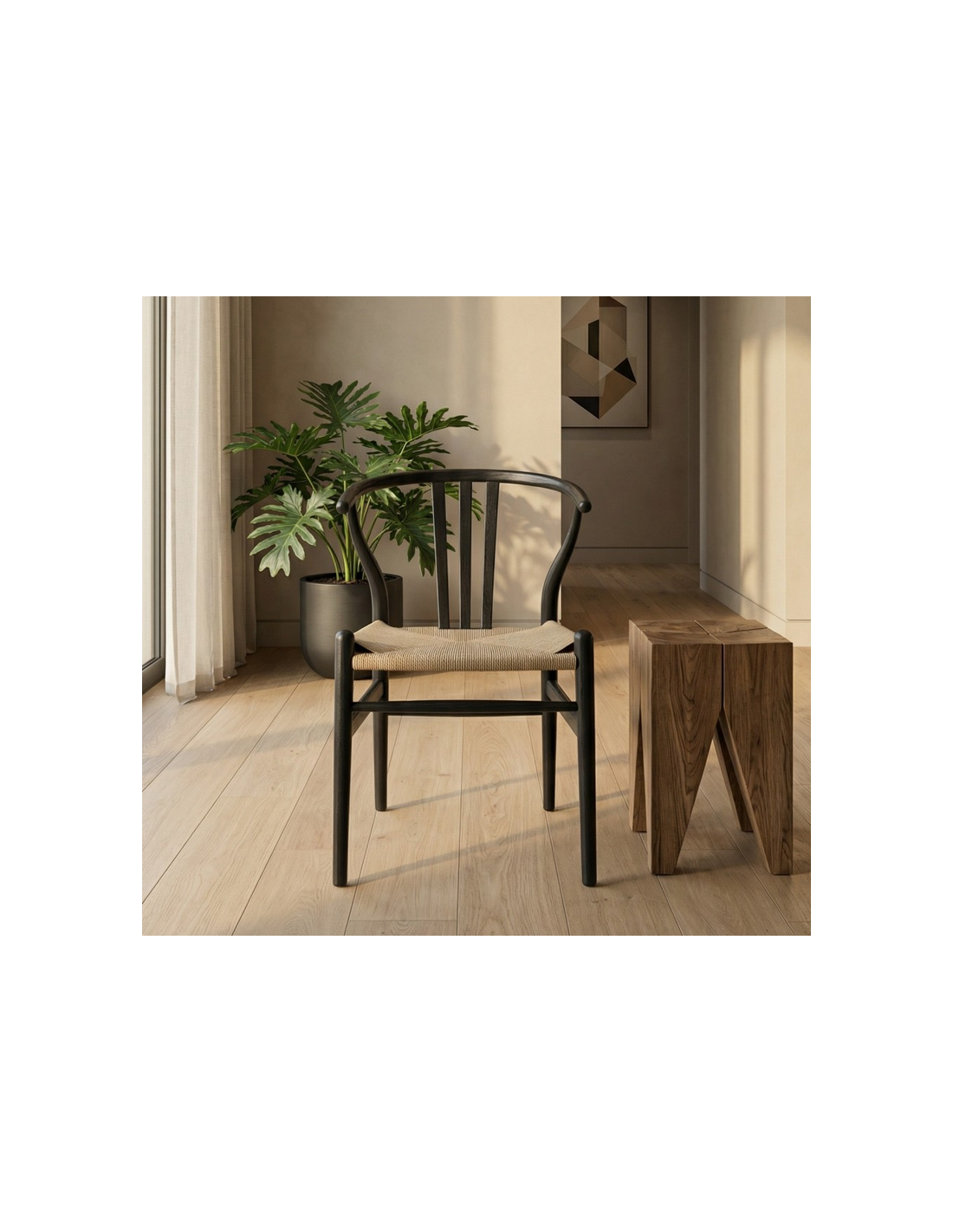 Sæt med 2 x Spisebordsstole i egetræ og papirreb H78 cm - Sort/Beige
