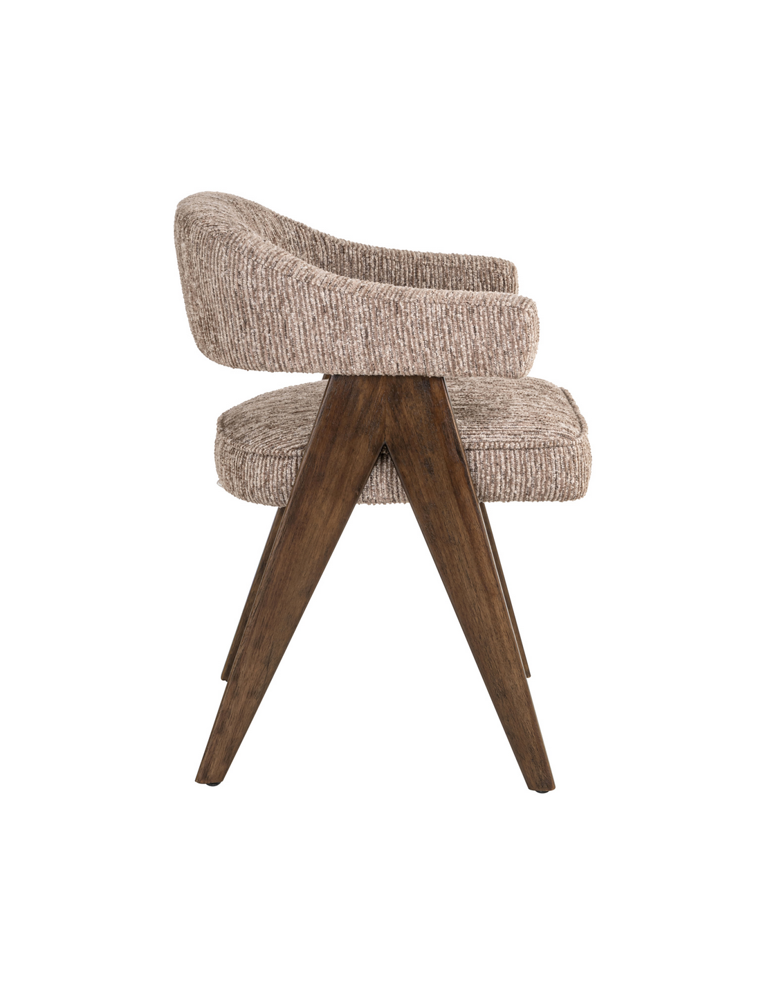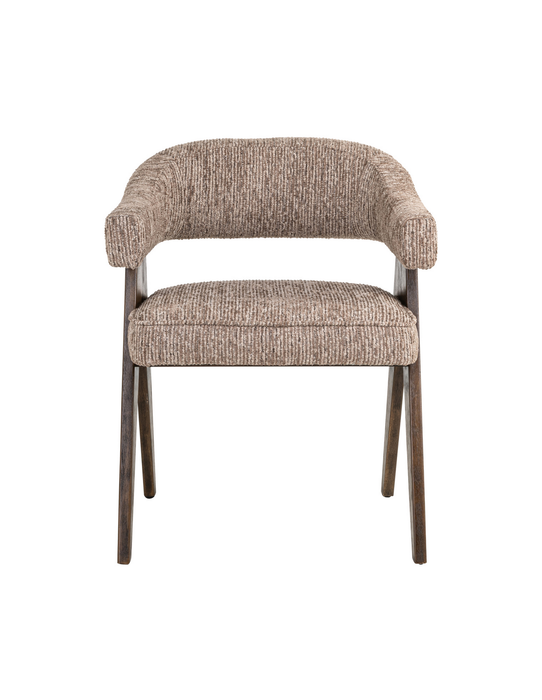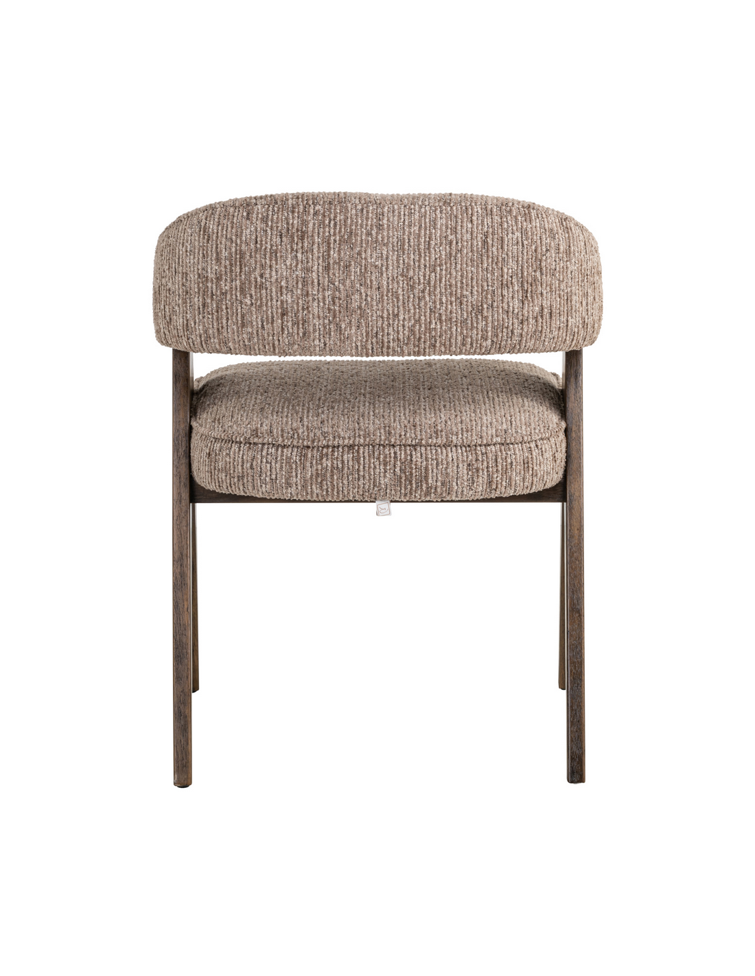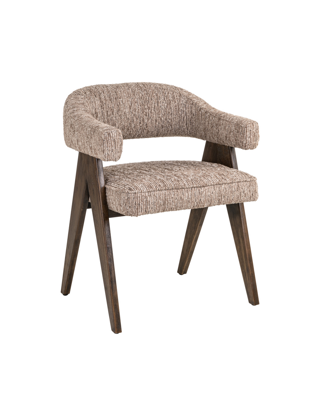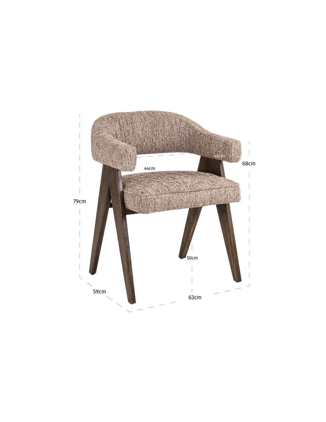 MORI Spisebordsstol med armlæn, udført i et design fra hollandske Richmond Interiors, fremstillet i brunlakeret fyrretræ og mokkafarvet chenille polyester. Stolen måler 79 cm i højden over ryggen og 63 x 59 cm i bredde og dybde.