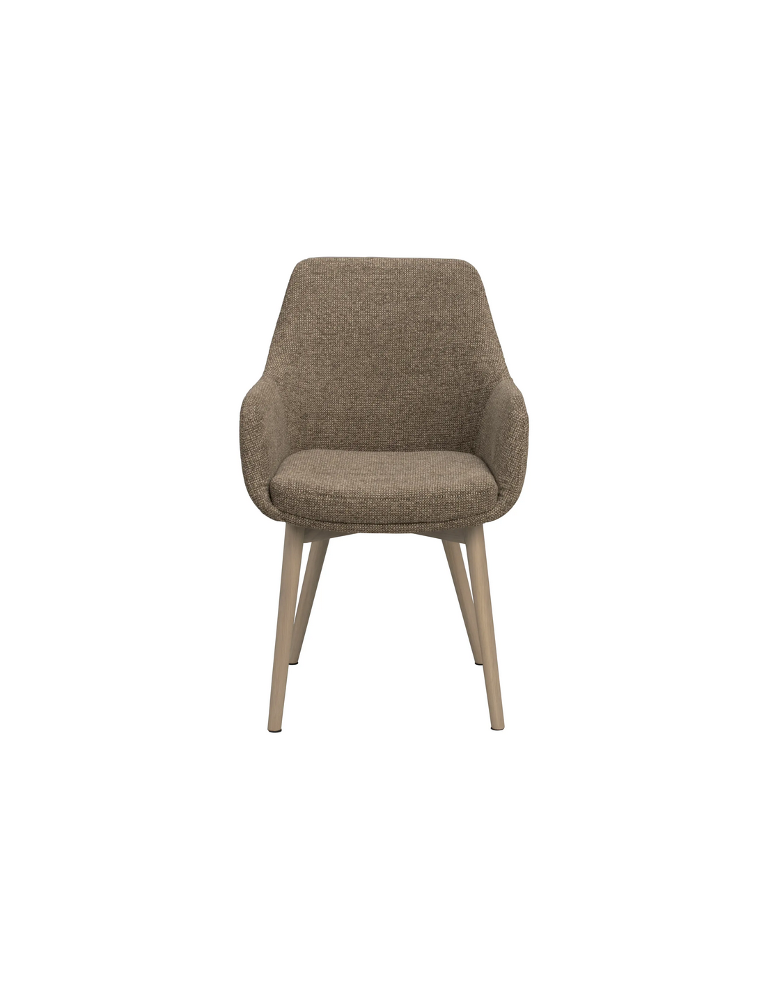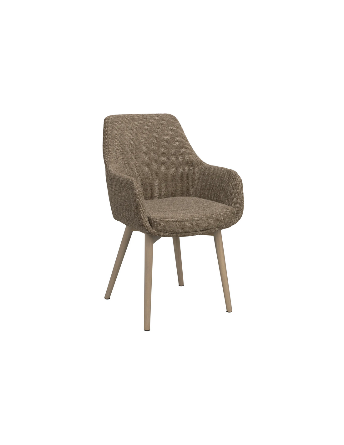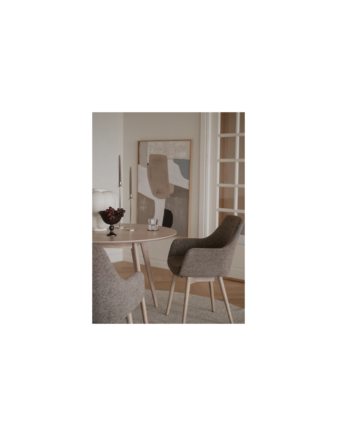 Denley sæt med 2 x spisebordsstole med armlæn, udført i et design fremstillet af white wash lakeret egetræ og mørk beige polyester. Stolene måler 88 cm i højden over ryggen og med siddehøjde på 49 cm.