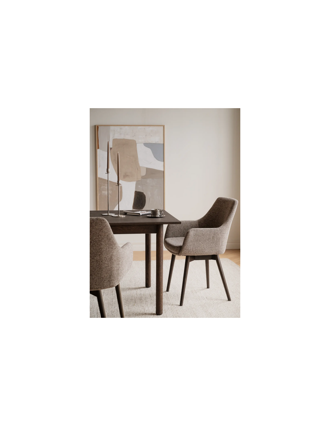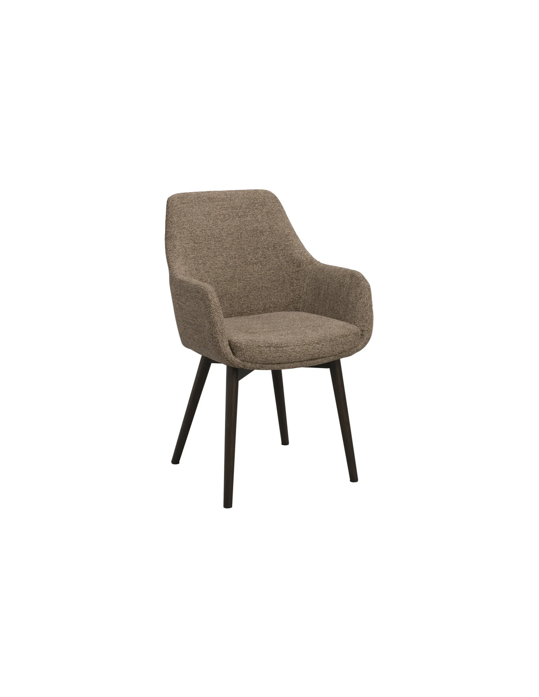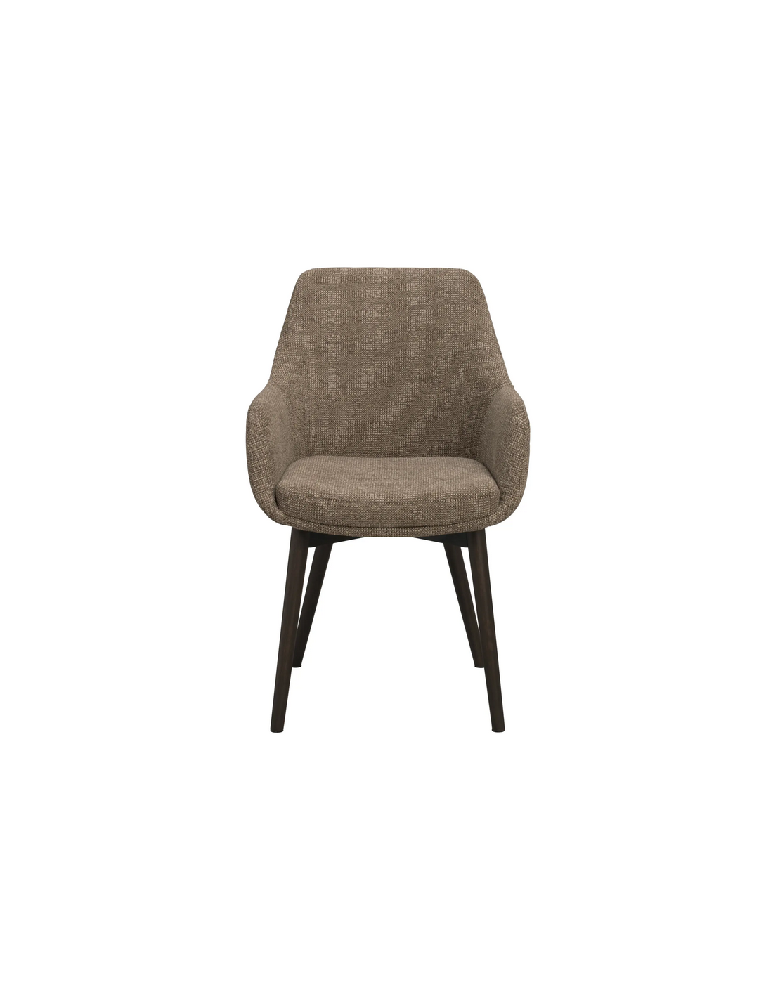 Denley sæt med 2 x spisebordsstole med armlæn, udført i et design fremstillet af brunlakeret egetræ og mørk beige polyester. Stolene måler 88 cm i højden over ryggen og med siddehøjde på 49 cm.