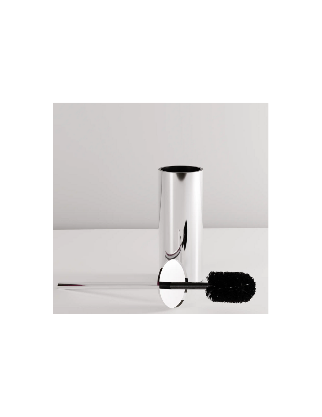 Toiletbørste udført i et moderne og stilrent design af kromlakeret metal og kunststof. Toiletbørsten er til gulv og måler 40 cm i højden og 9 cm i diameter.