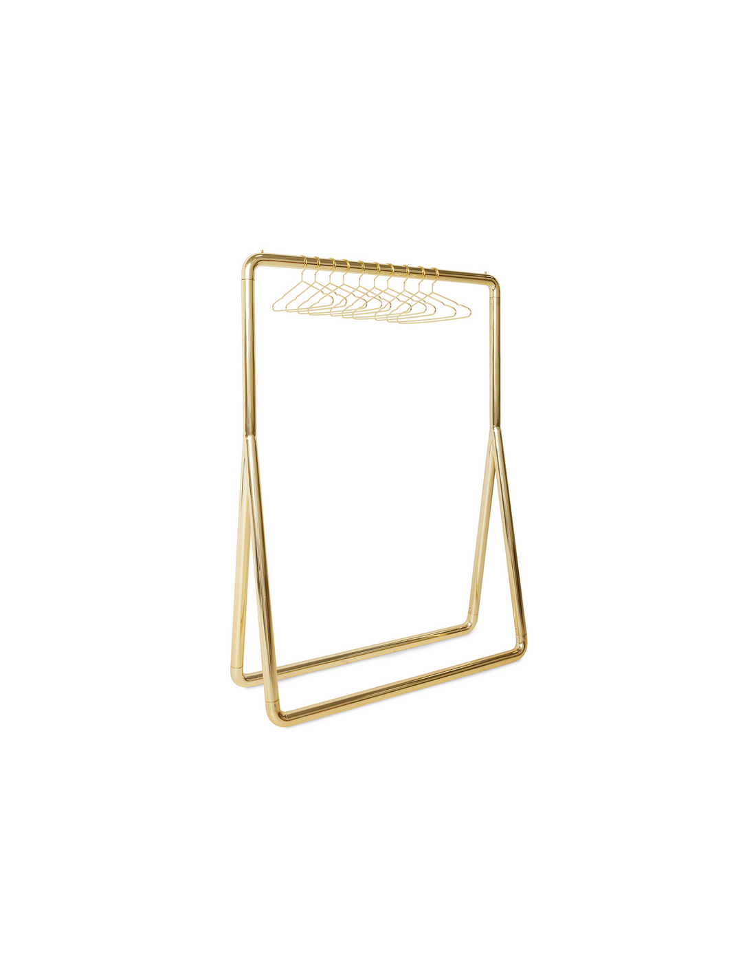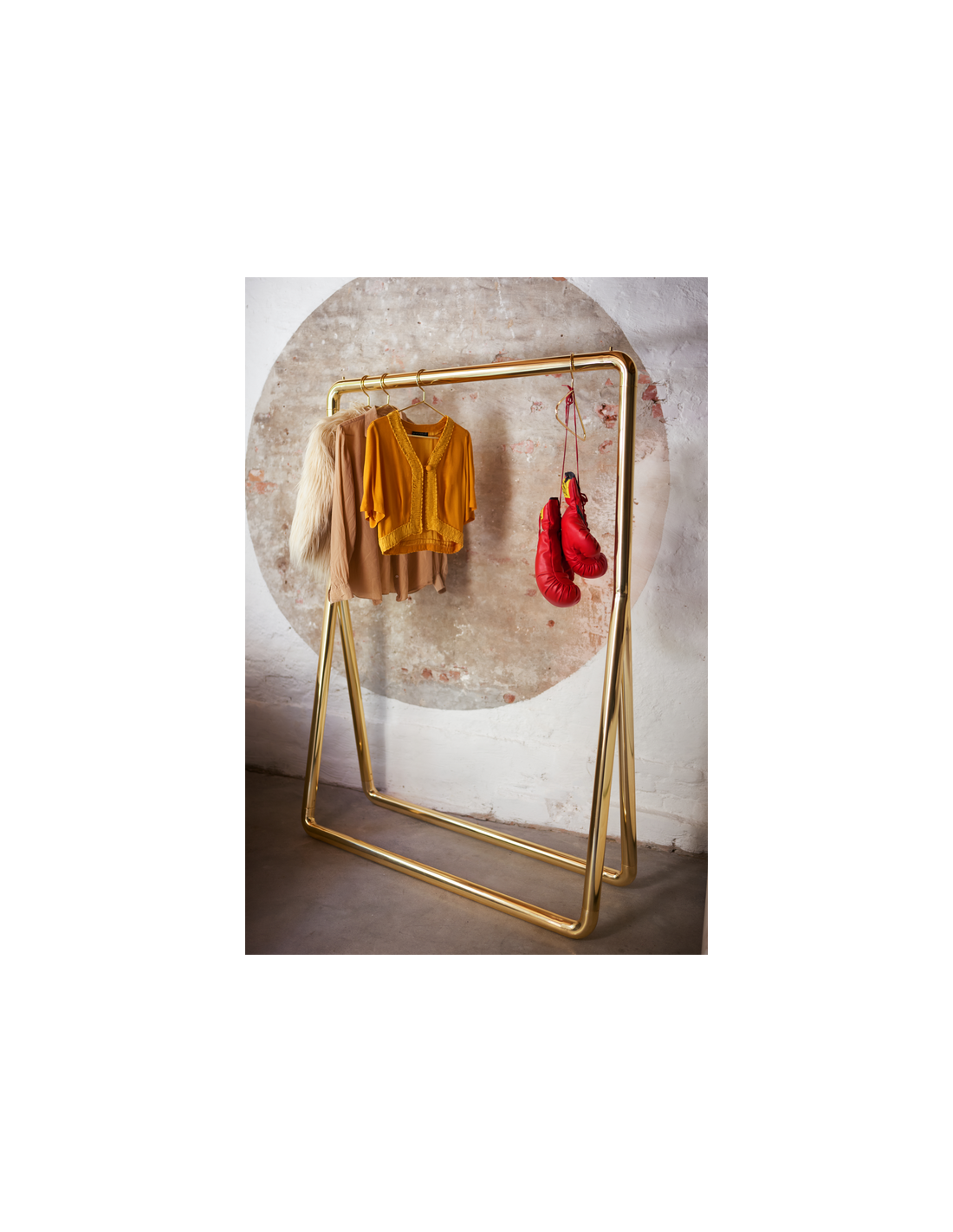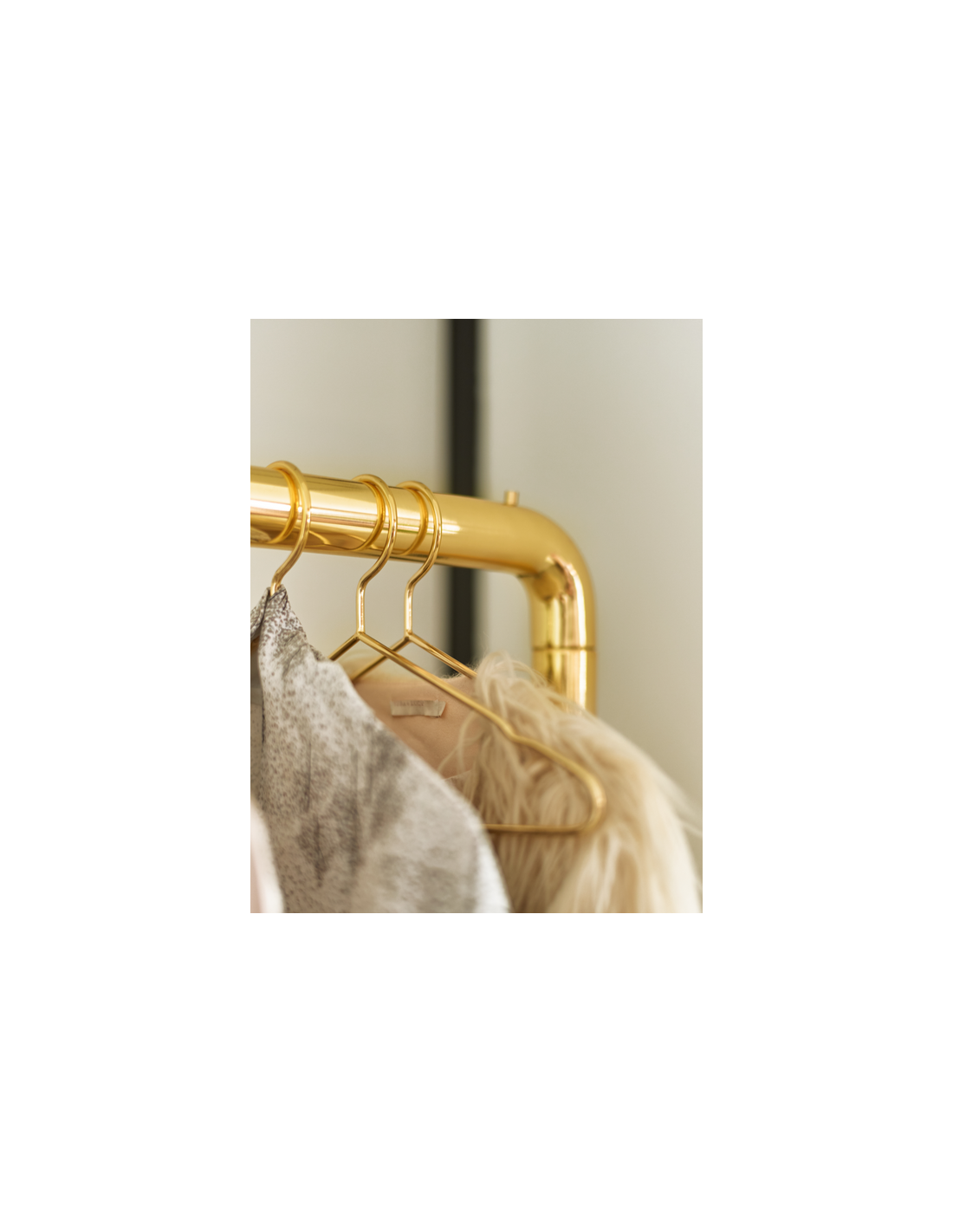 Tøjstativ med 10 bøjler, udført i et moderne design fra HK Living. Stativet er fremstillet i messinglakeret stål og måler 175 cm i højden og 125 x 44 cm i bredde og dybde.