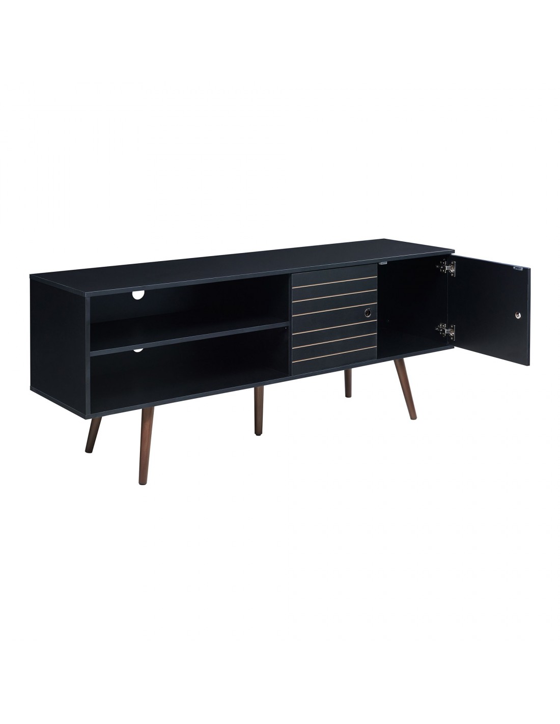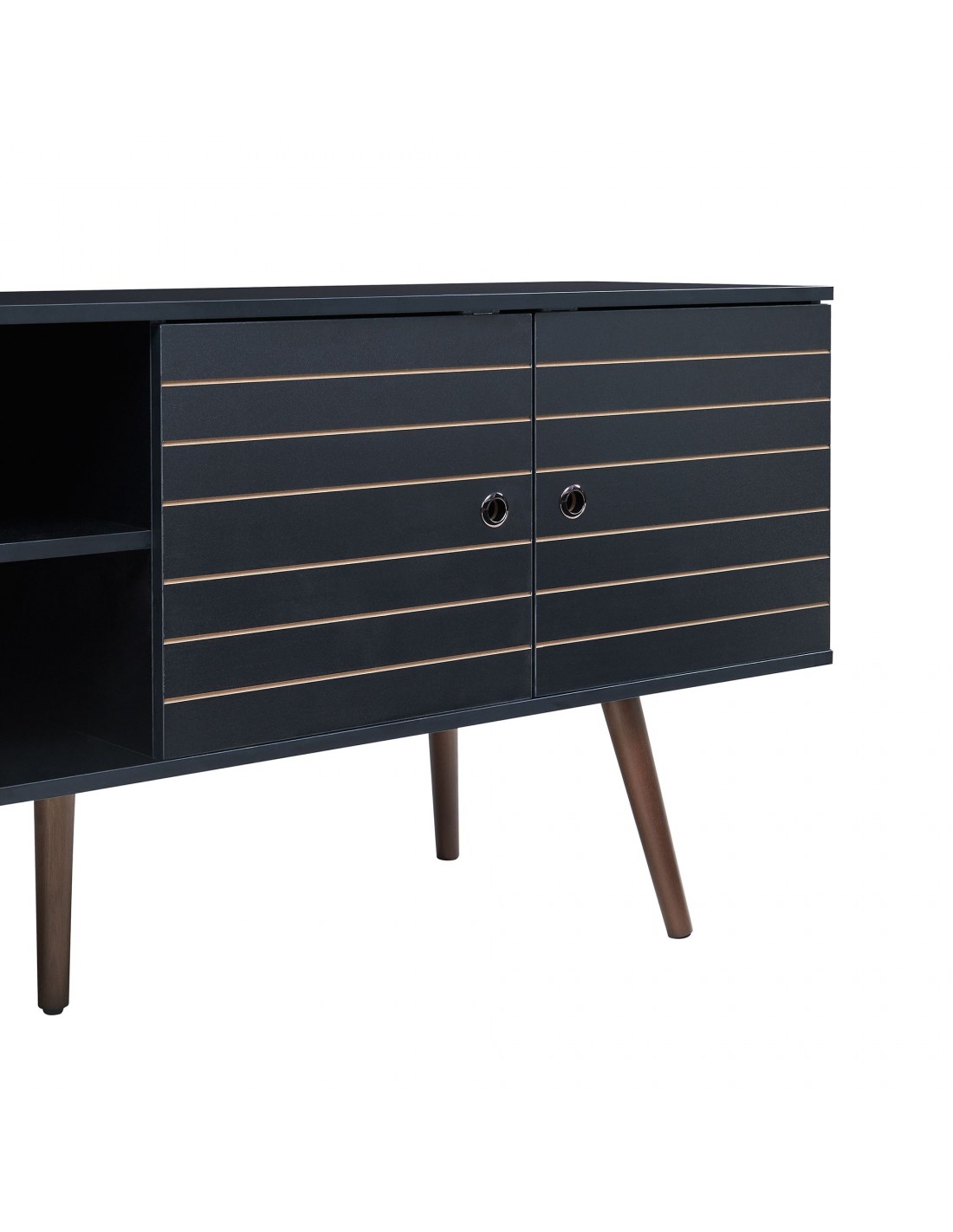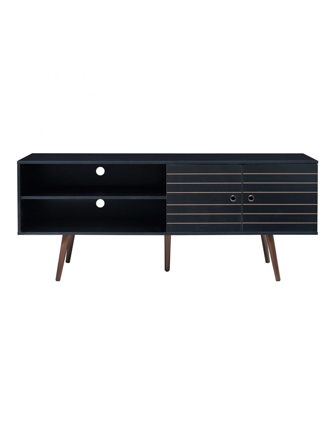 VARI Tvbord udført i et moderne og Skandinavisk design af brunlakeret træ og grå møbelplade. Tvbordet har 2 åbne hylderum samt 1 dobbeltskab med opbevaringsrum. Tvbordet måler 65,5 cm i højden og 160 x 40 cm i bredde og dybde.