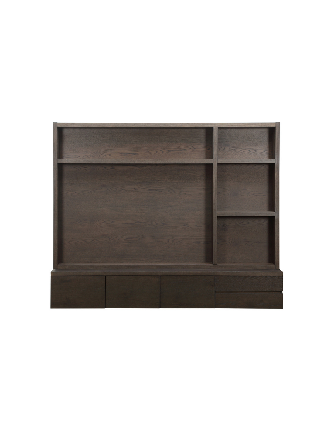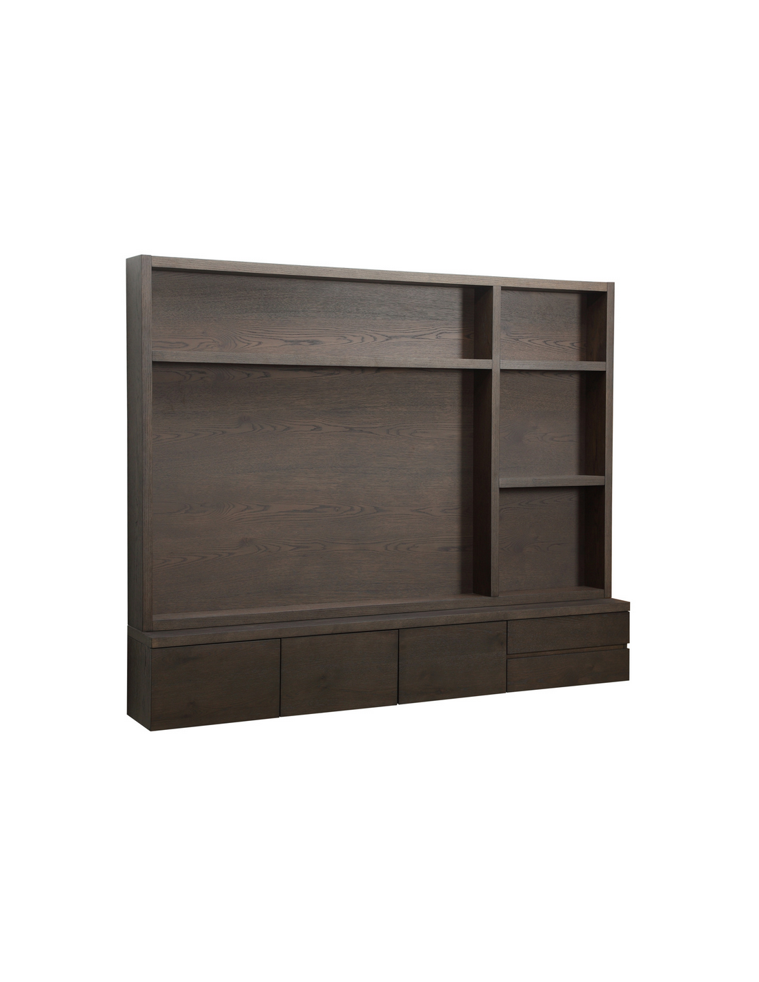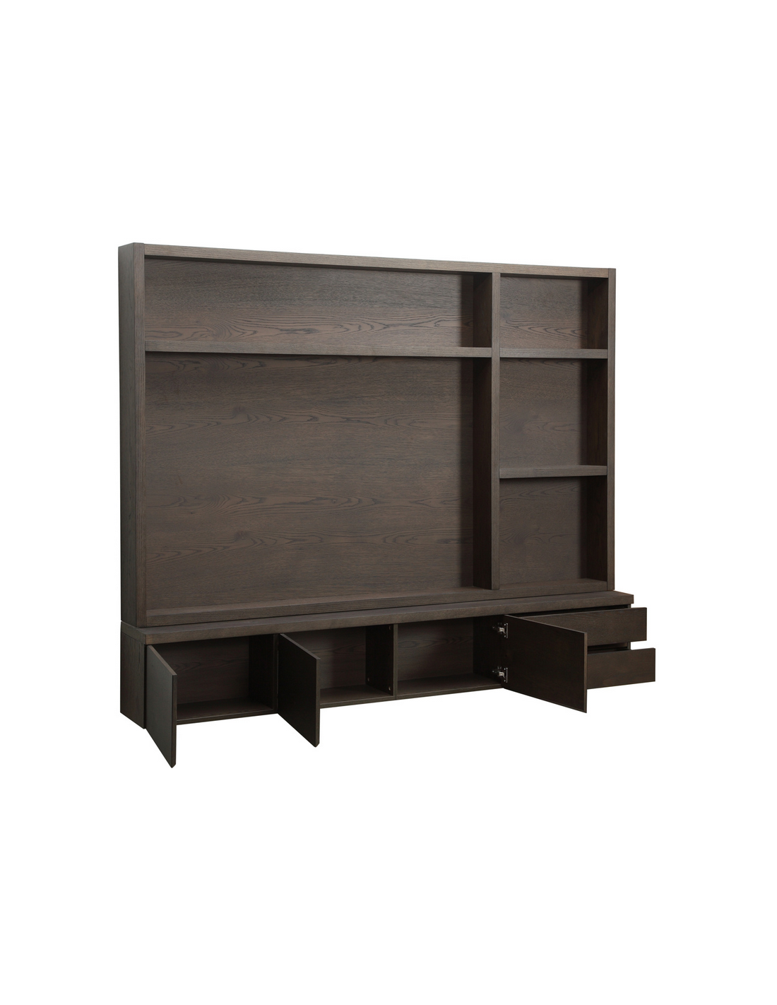 LACHANCE Væghængt tvbord fra hollandske Richmond Interiors, udført i et design af brunlakeret egetræsfinér og MDF. Tvbordet måler 176 cm i højden og 220 x 30 cm i bredde og dybde og indeholder 1 rum til tv´et, 4 åbne hylderum, 2 skuffer samt 3 skabe.