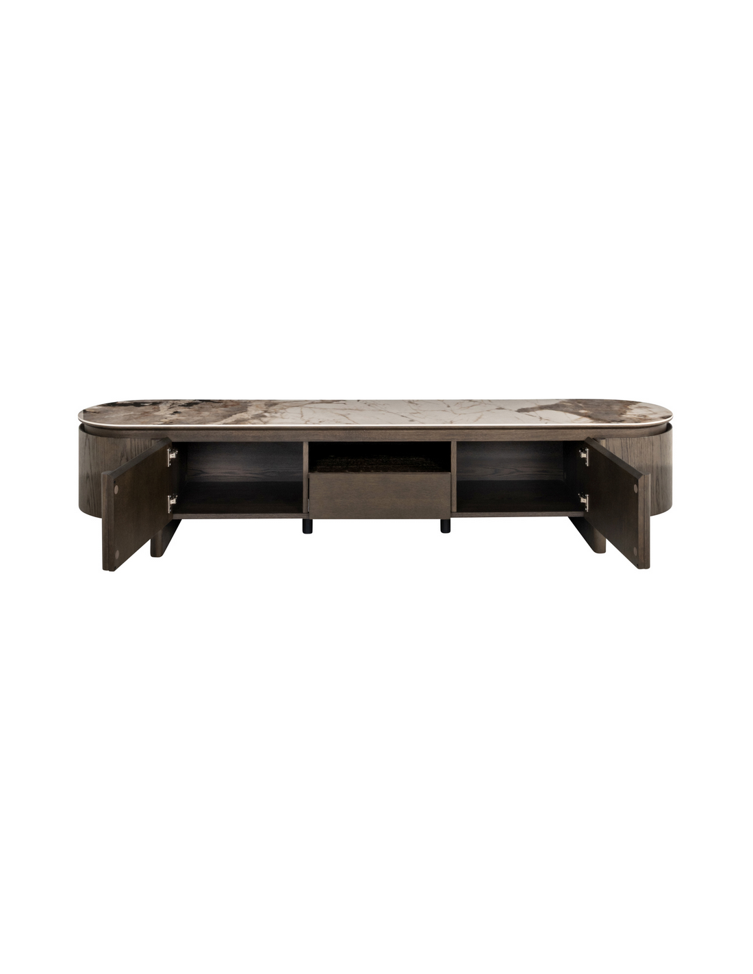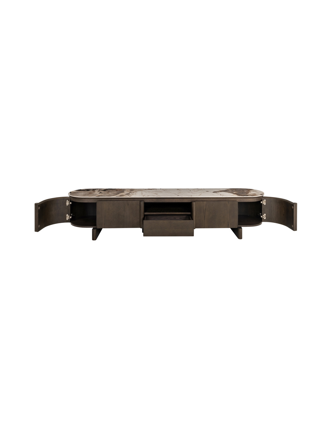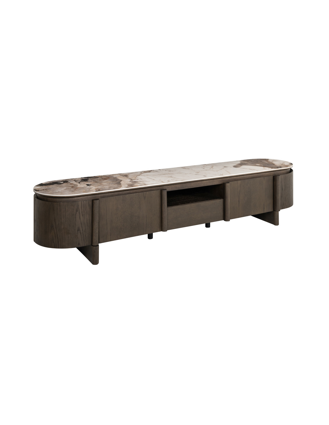LANGFORD Tvbord fra hollandske Richmond Interiors, udført i et design af brunlakeret egetræsfinér, MDF og med topplade i brun marmoriseret keramik. Tvbordet måler 45,5 cm i højden og 220 x 47 cm i bredde og dybde.