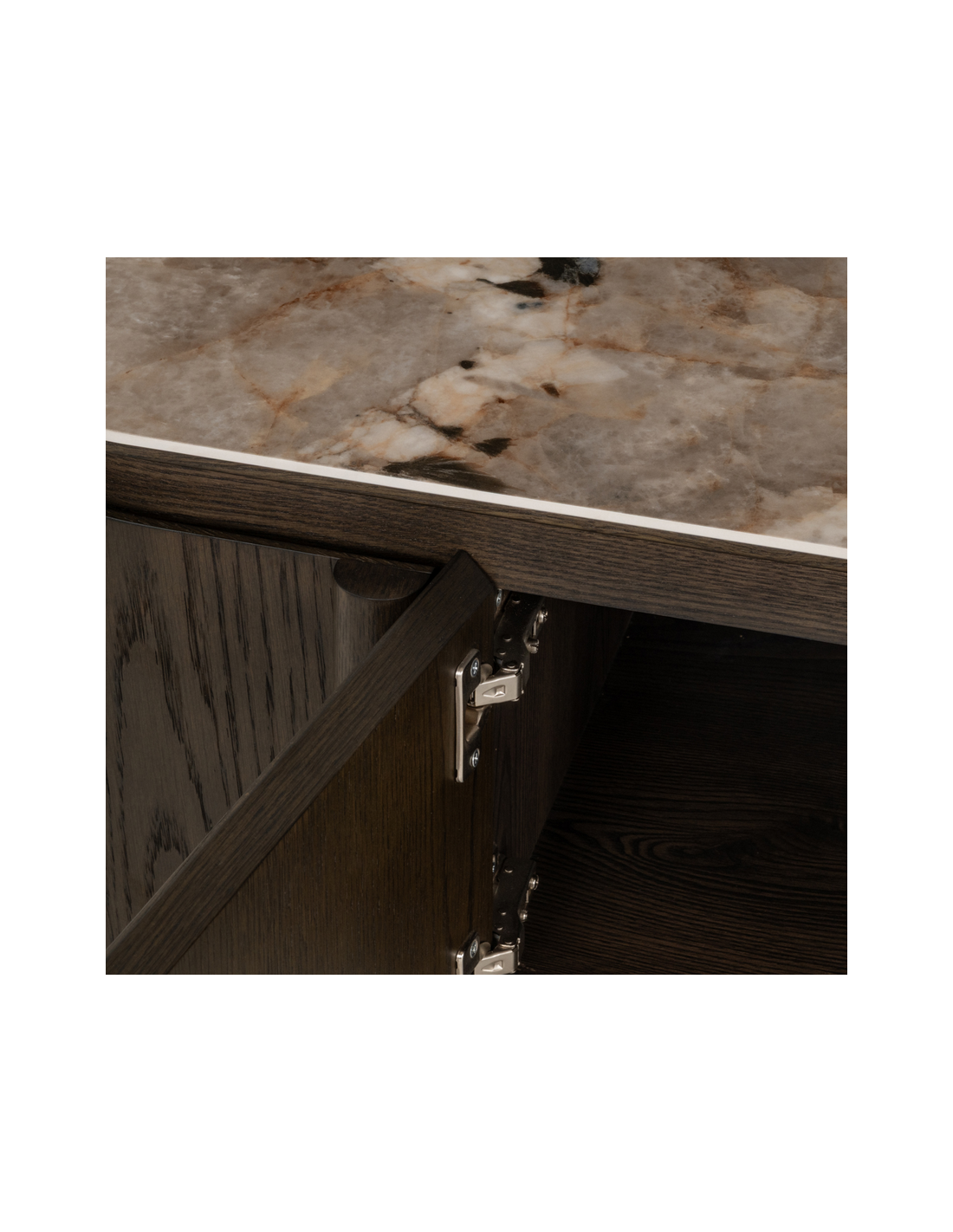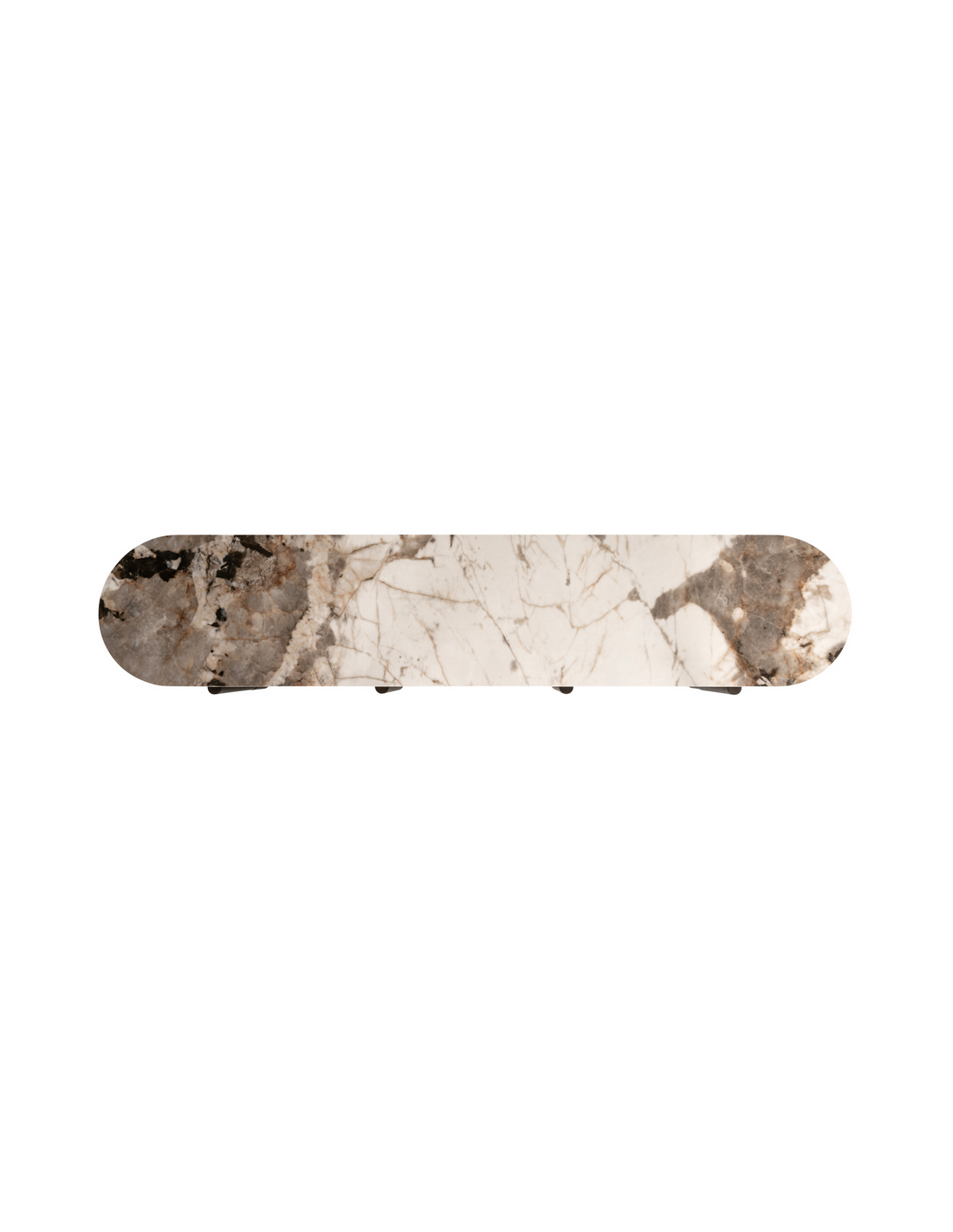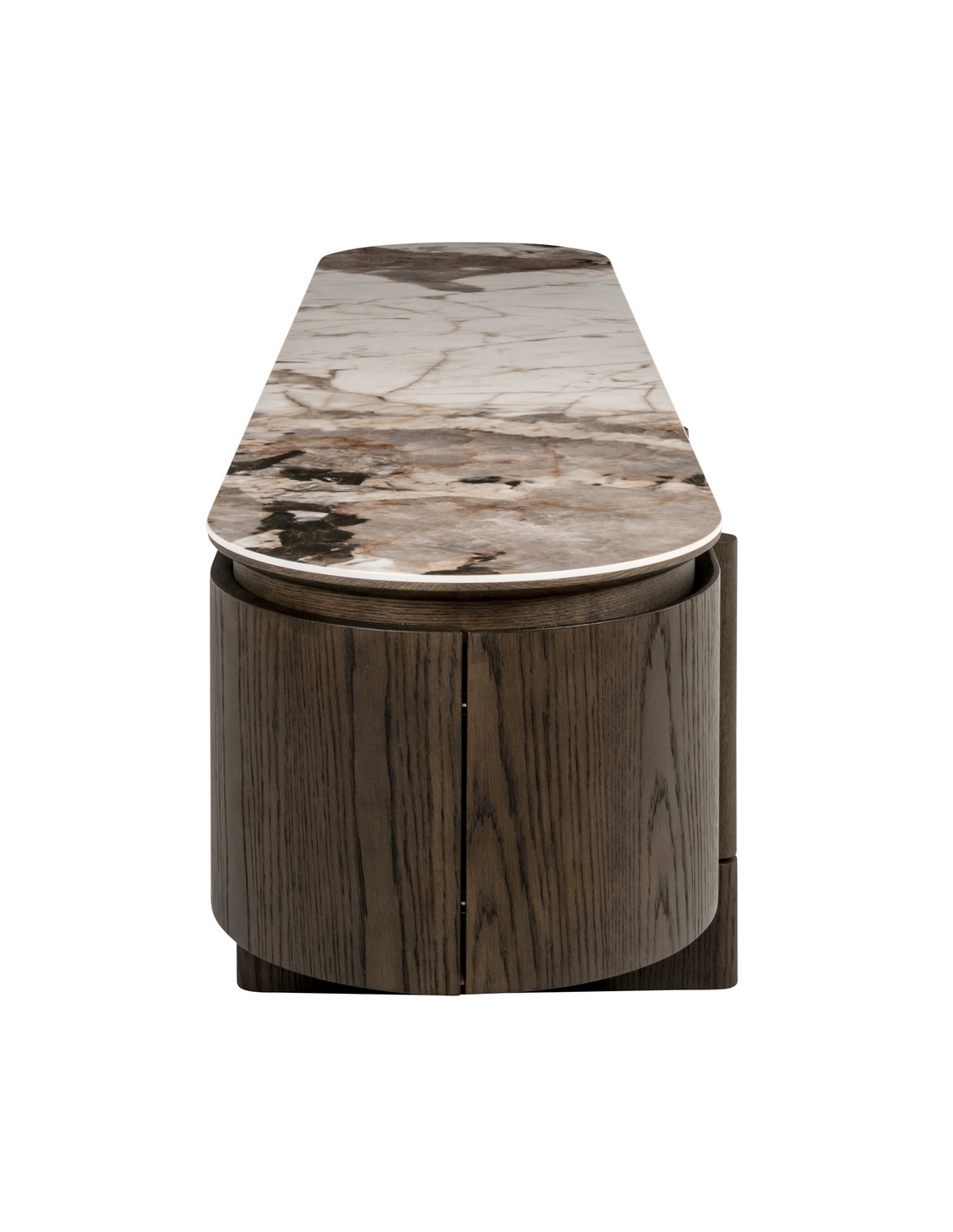 LANGFORD Tvbord fra hollandske Richmond Interiors, udført i et design af brunlakeret egetræsfinér, MDF og med topplade i brun marmoriseret keramik. Tvbordet måler 45,5 cm i højden og 220 x 47 cm i bredde og dybde.