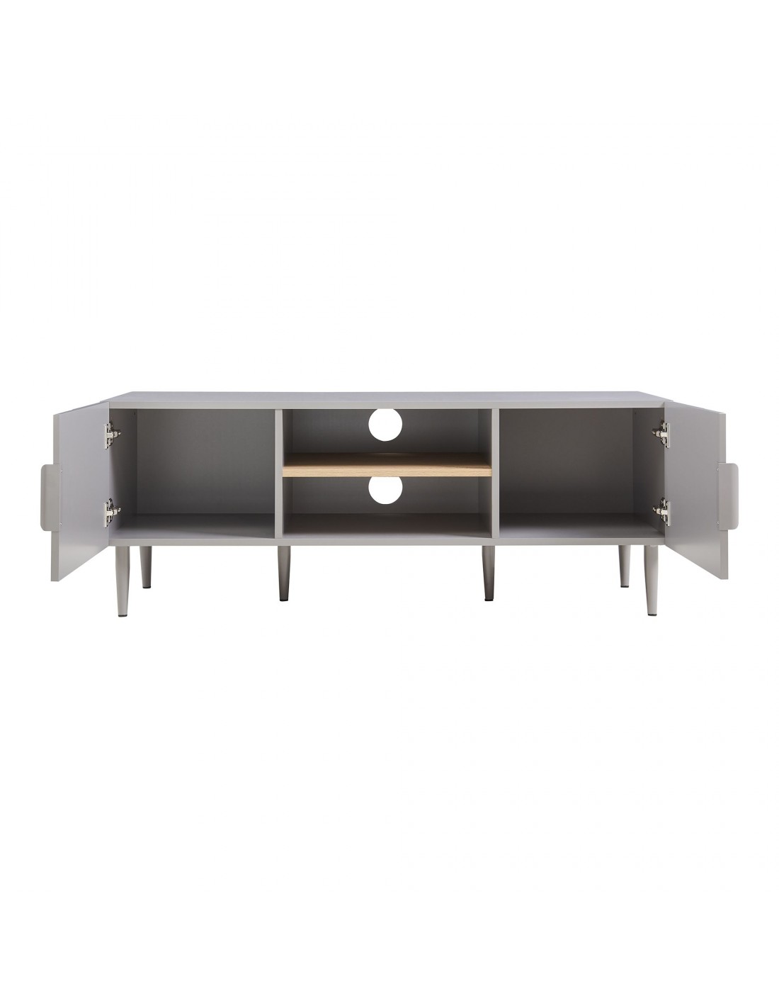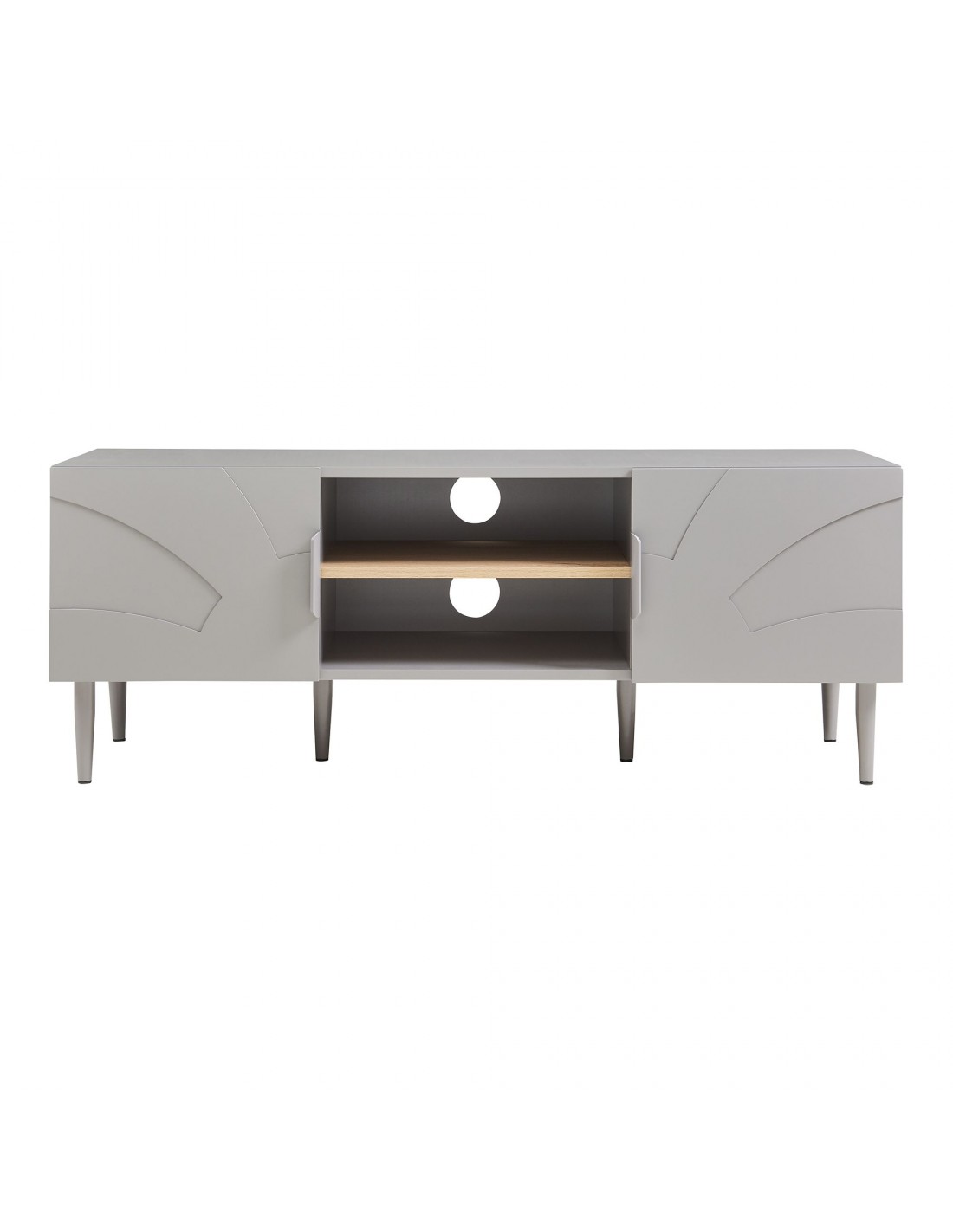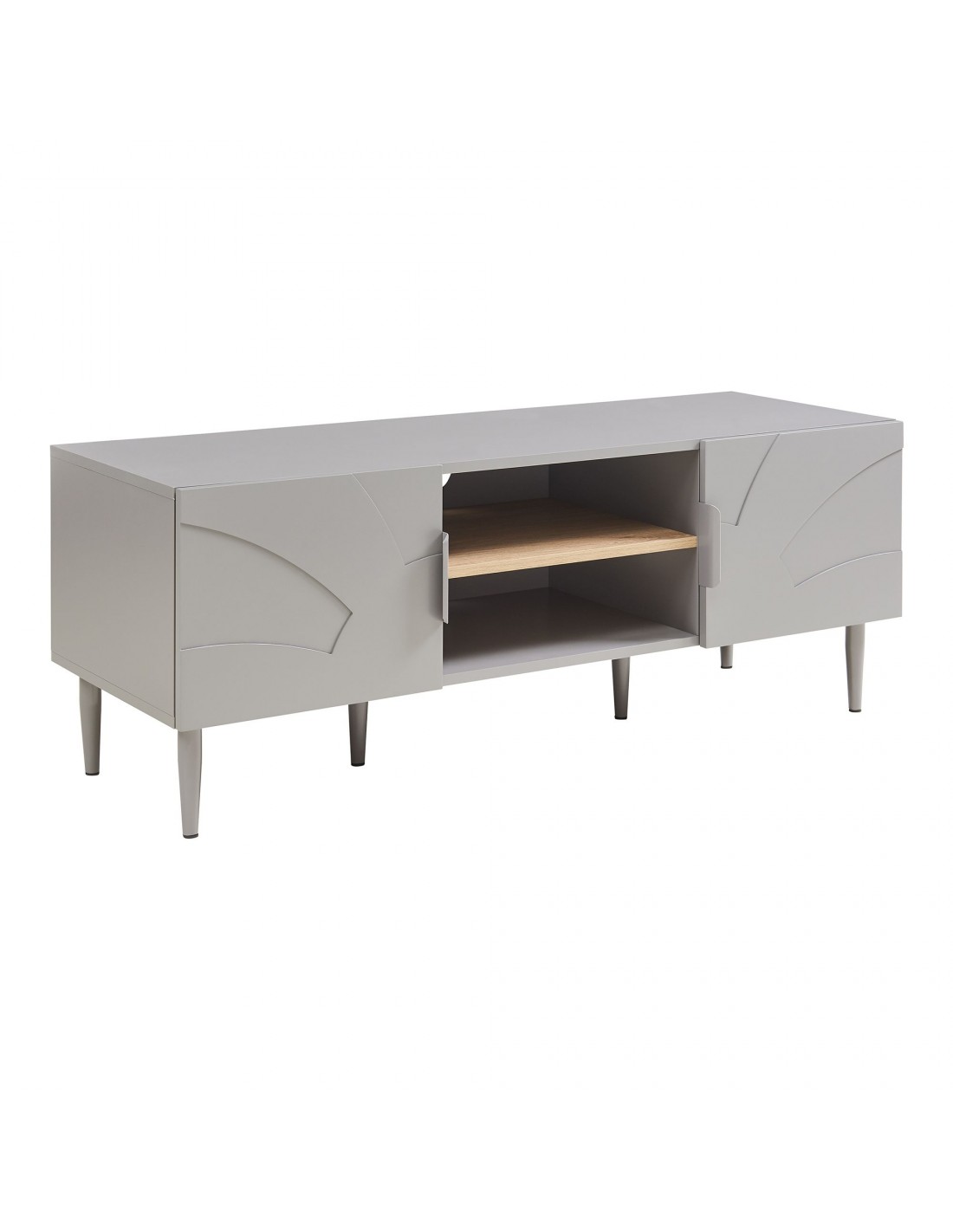 STAR Tvbord udført i et moderne og Skandinavisk design af grålakeret stål og grå og egetræsfarvet MDF. Tvbordet har 2 skabe og 2 åbne hylderum. Tvbordet måler 45 cm i højden og 120 x 40 cm i bredde og dybde.