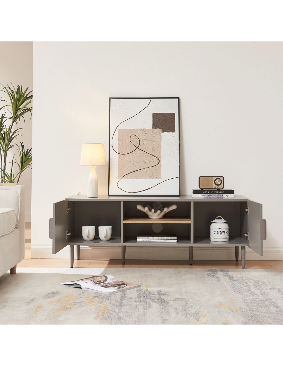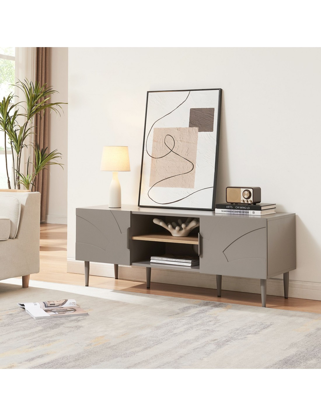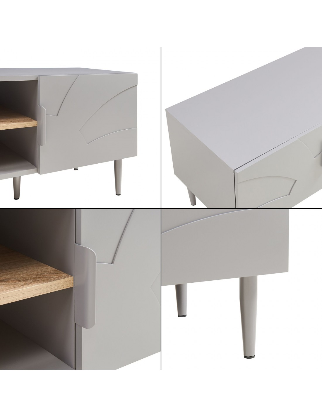 STAR Tvbord udført i et moderne og Skandinavisk design af grålakeret stål og grå og egetræsfarvet MDF. Tvbordet har 2 skabe og 2 åbne hylderum. Tvbordet måler 45 cm i højden og 120 x 40 cm i bredde og dybde.