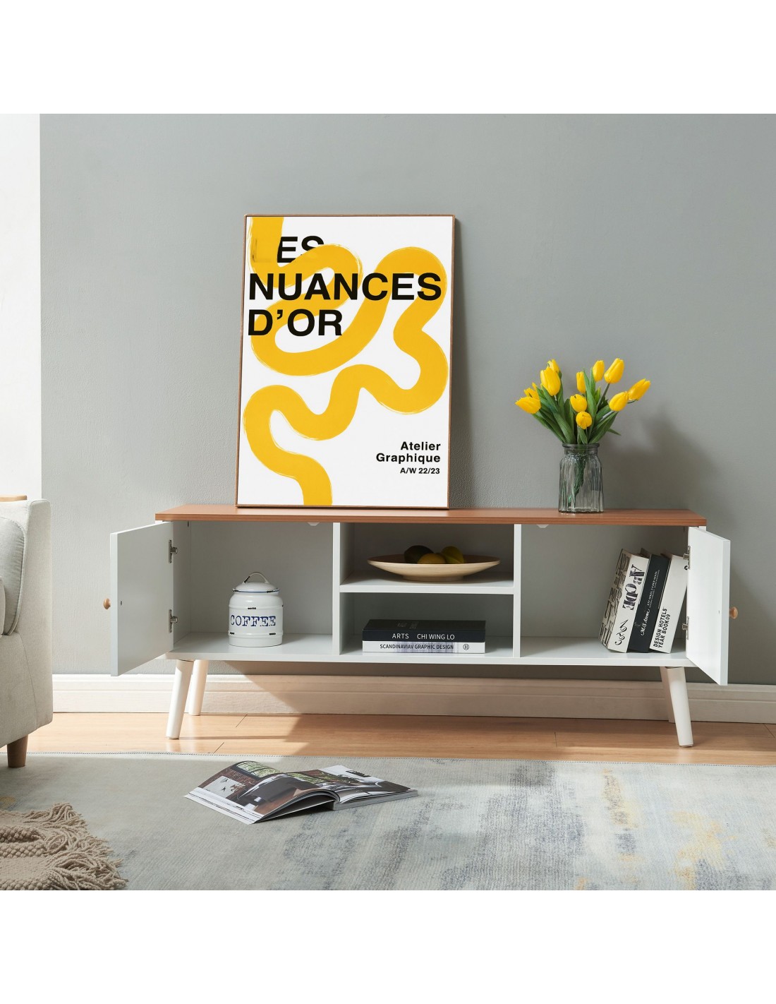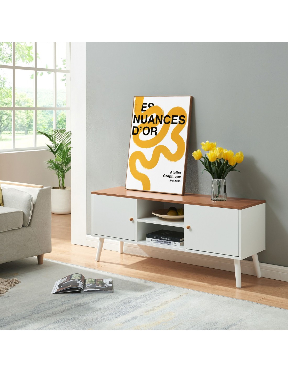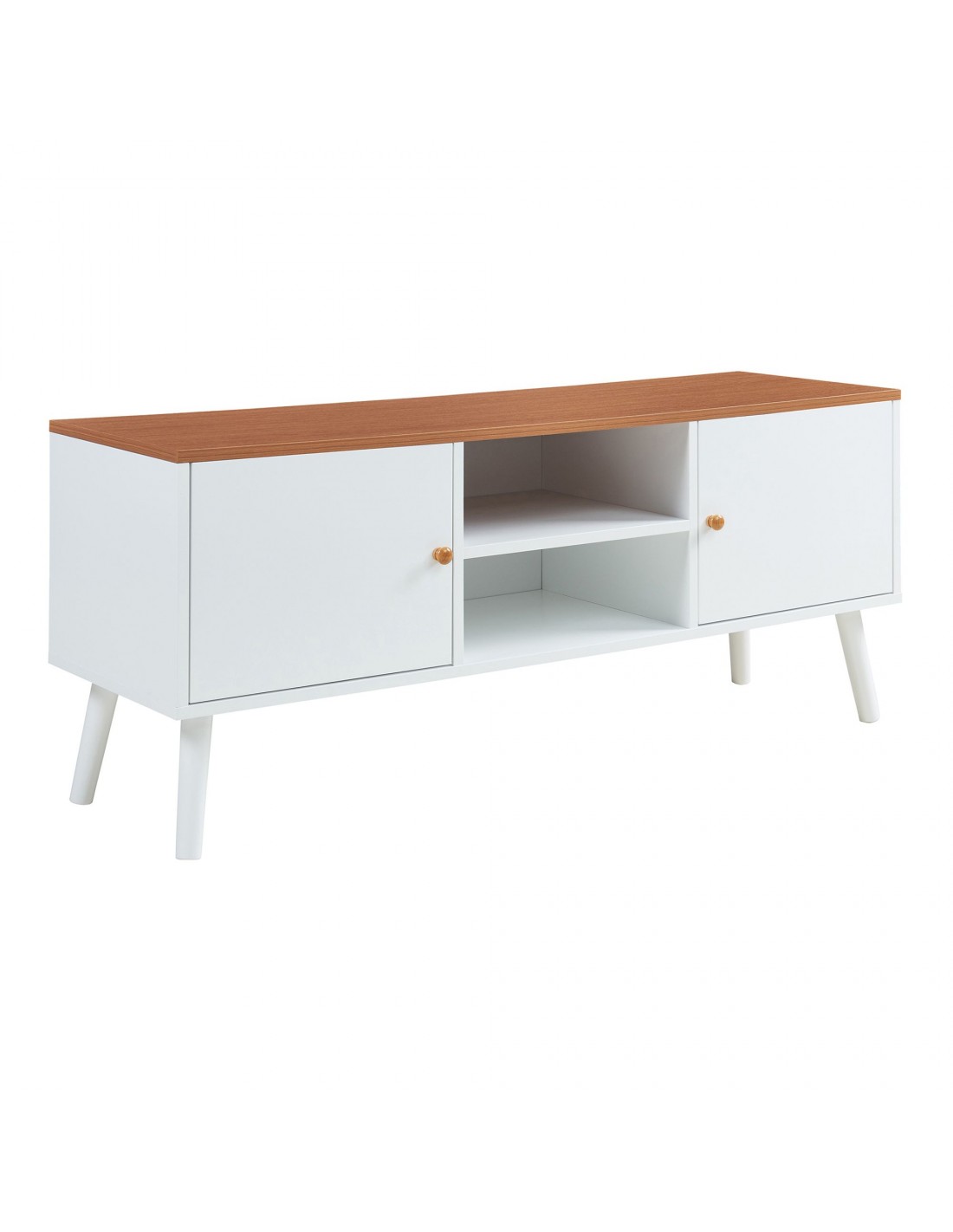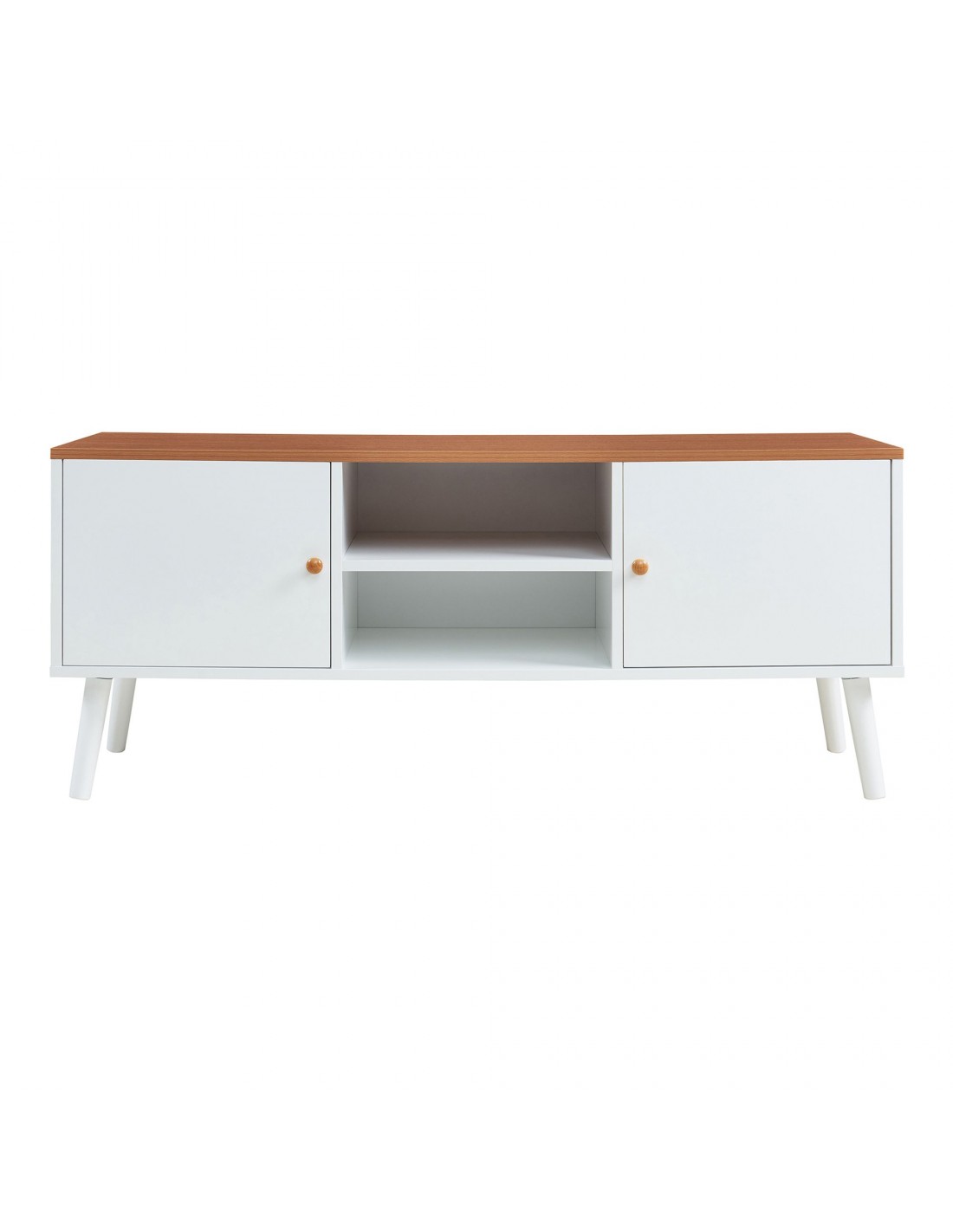REY Tvbord udført i et moderne og Skandinavisk design af hvidlakeret fyrretræ og hvid og brun MDF. Tvbordet har 2 skabe og 2 åbne hylderum. Tvbordet måler 50 cm i højden og 120 x 35 cm i bredde og dybde.