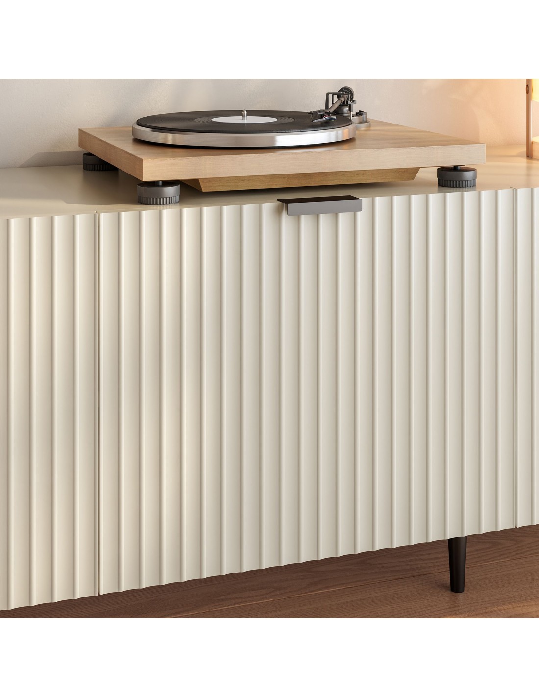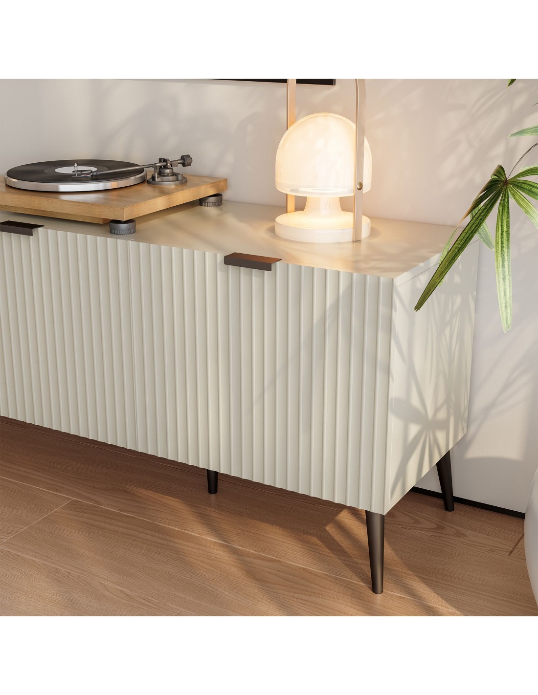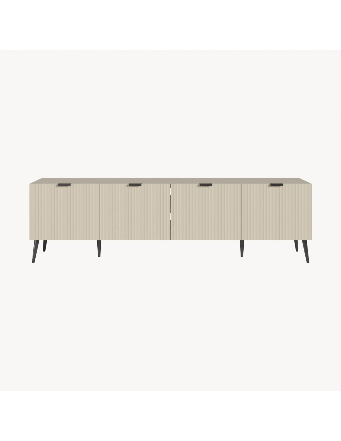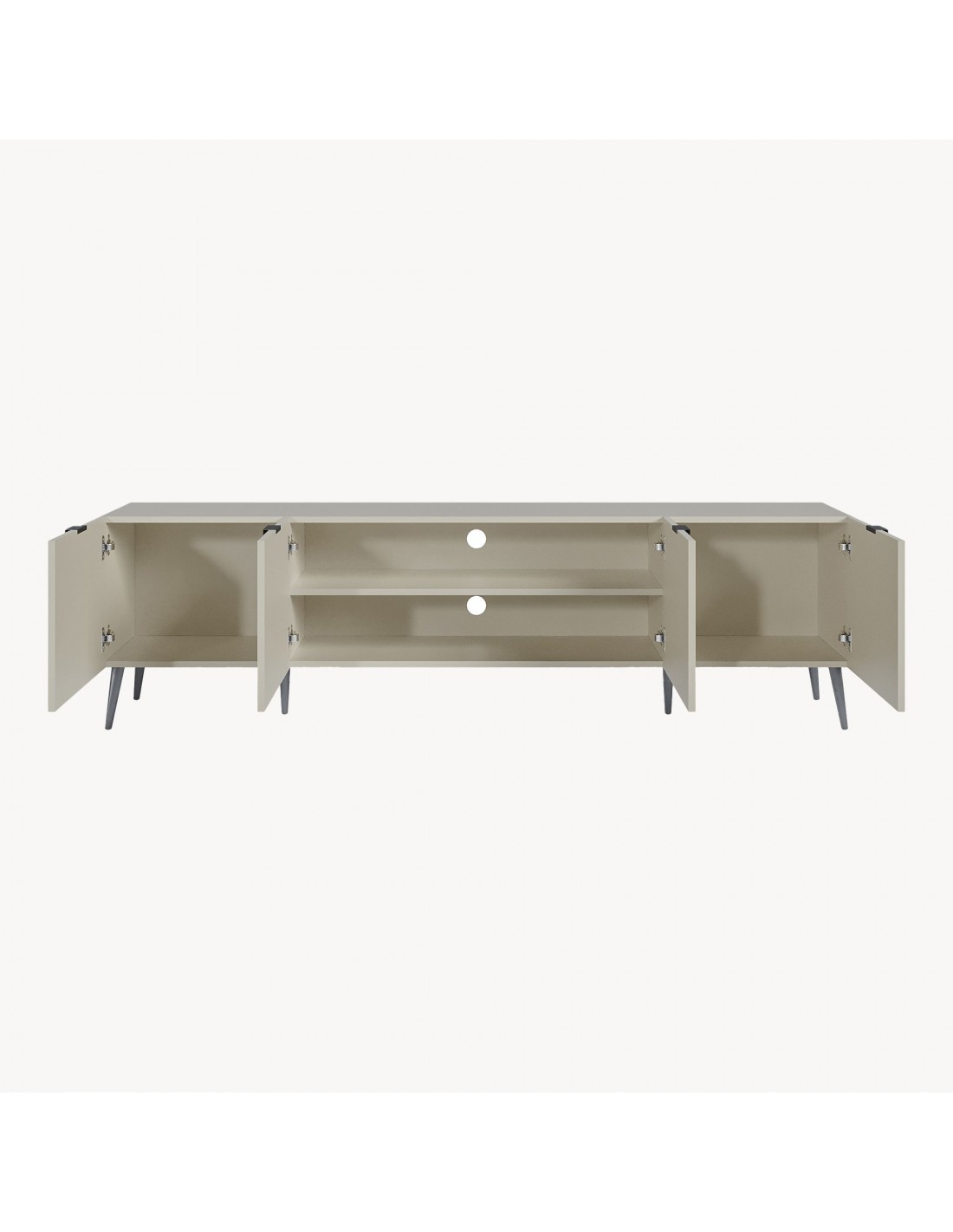 NAN Tvbord udført i et moderne og Skandinavisk design af sortlakeret metal og sandfarvet møbelplade. Tvbordet har 4 skabslåger og måler 51 cm i højden og 180 x 35 cm i bredde og dybde.
