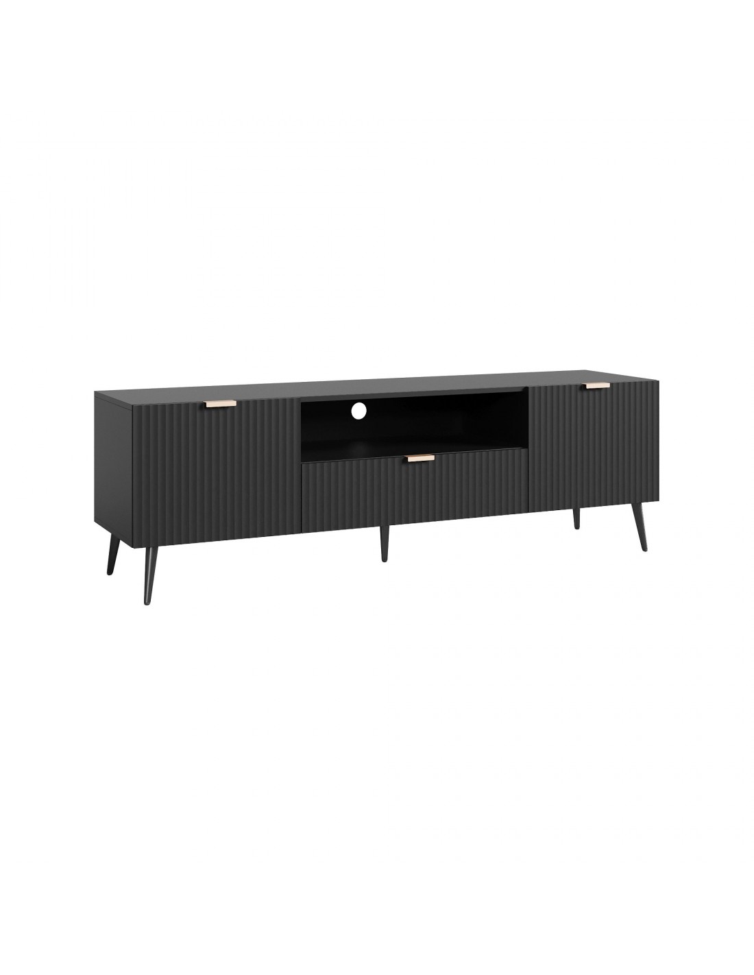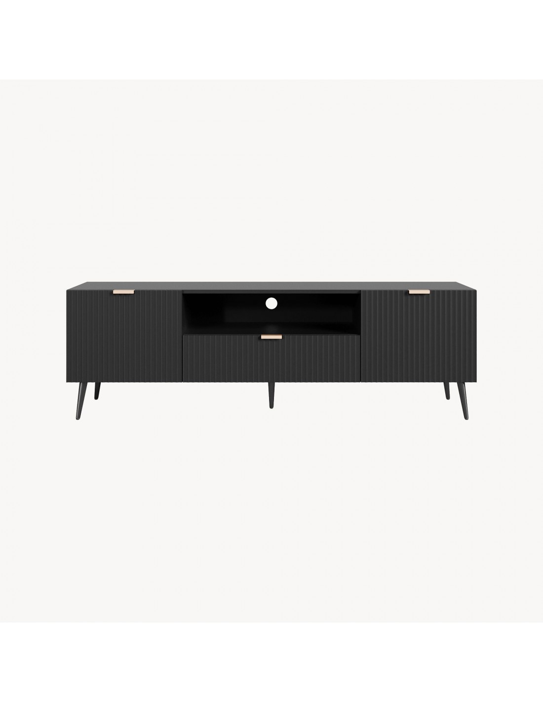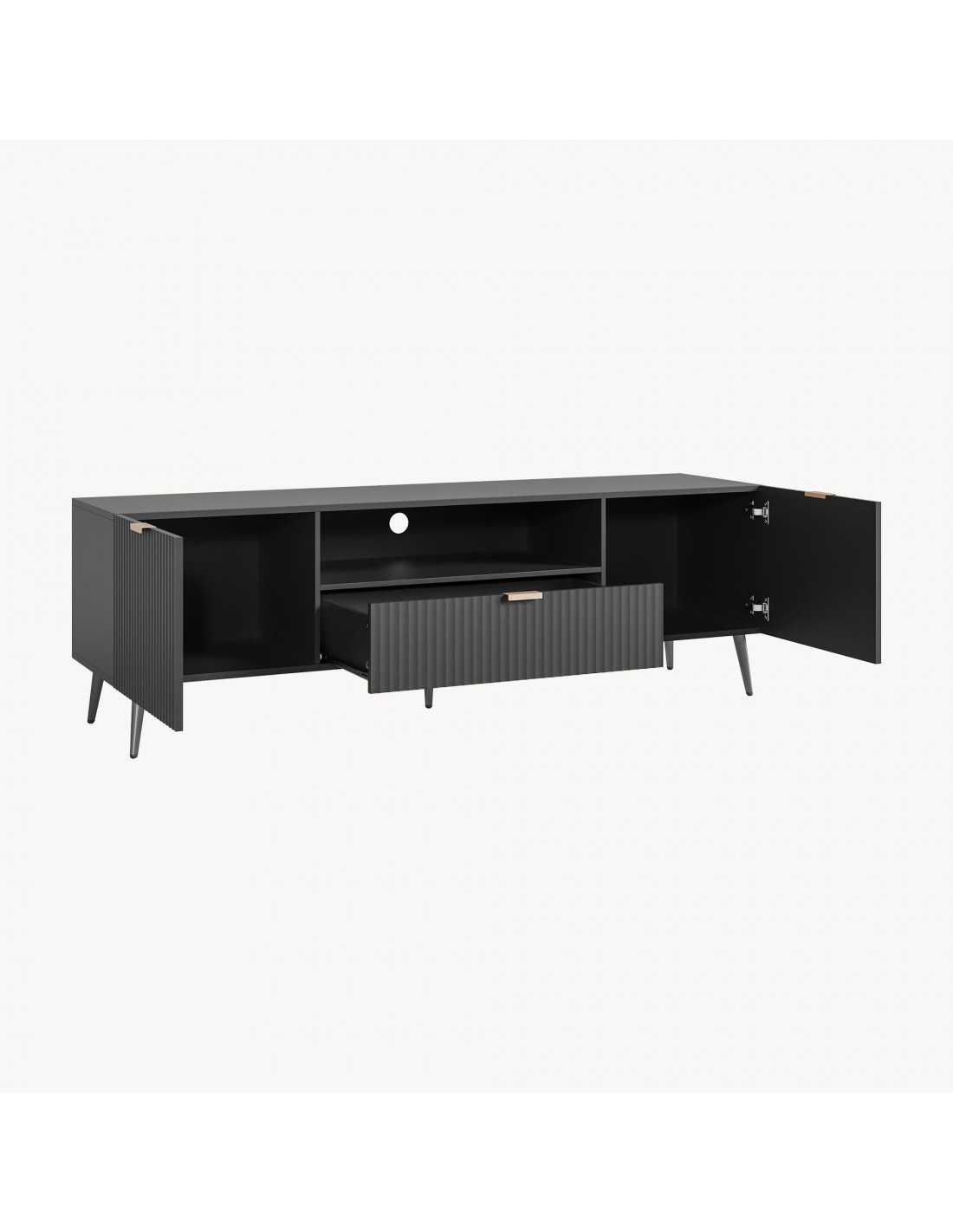 NAN Tvbord udført i et moderne og Skandinavisk design af sortlakeret metal og sort møbelplade. Tvbordet har 1 skuffe, 2 skabe og 1 åbent hylderum. Tvbordet måler 51 cm i højden og 160 x 40 cm i bredde og dybde.