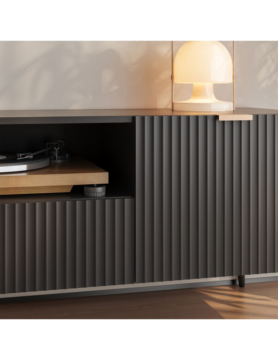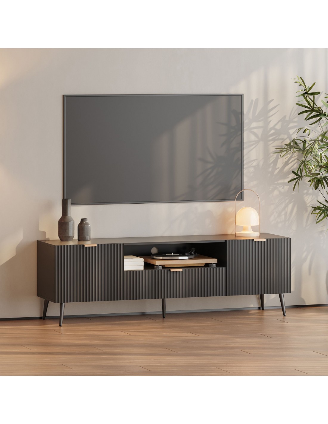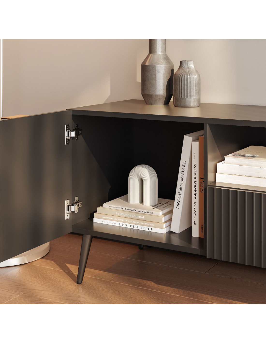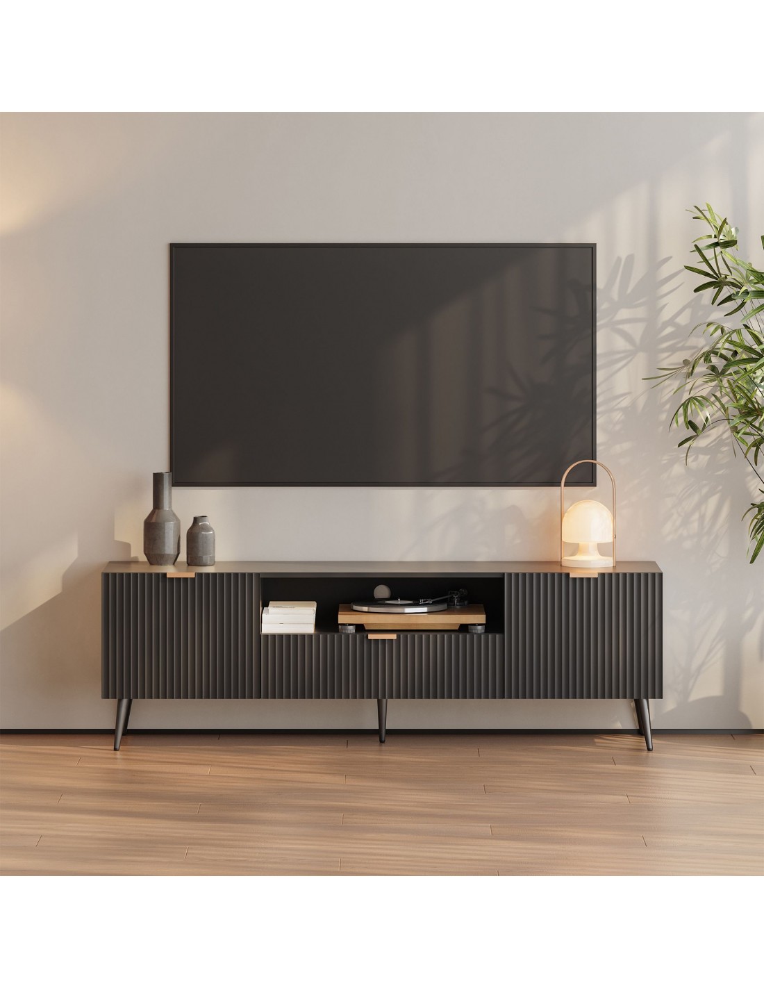 NAN Tvbord udført i et moderne og Skandinavisk design af sortlakeret metal og sort møbelplade. Tvbordet har 1 skuffe, 2 skabe og 1 åbent hylderum. Tvbordet måler 51 cm i højden og 160 x 40 cm i bredde og dybde.