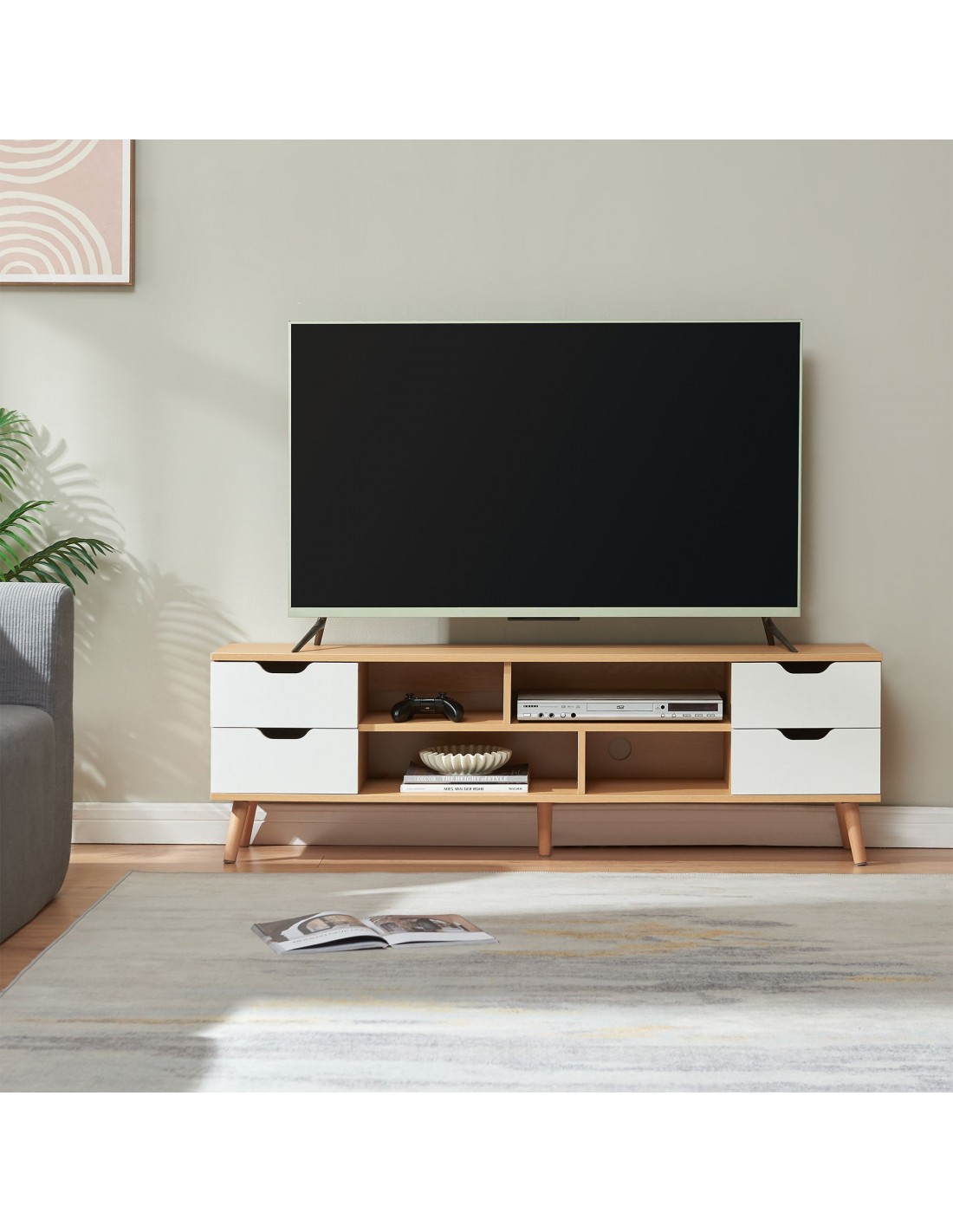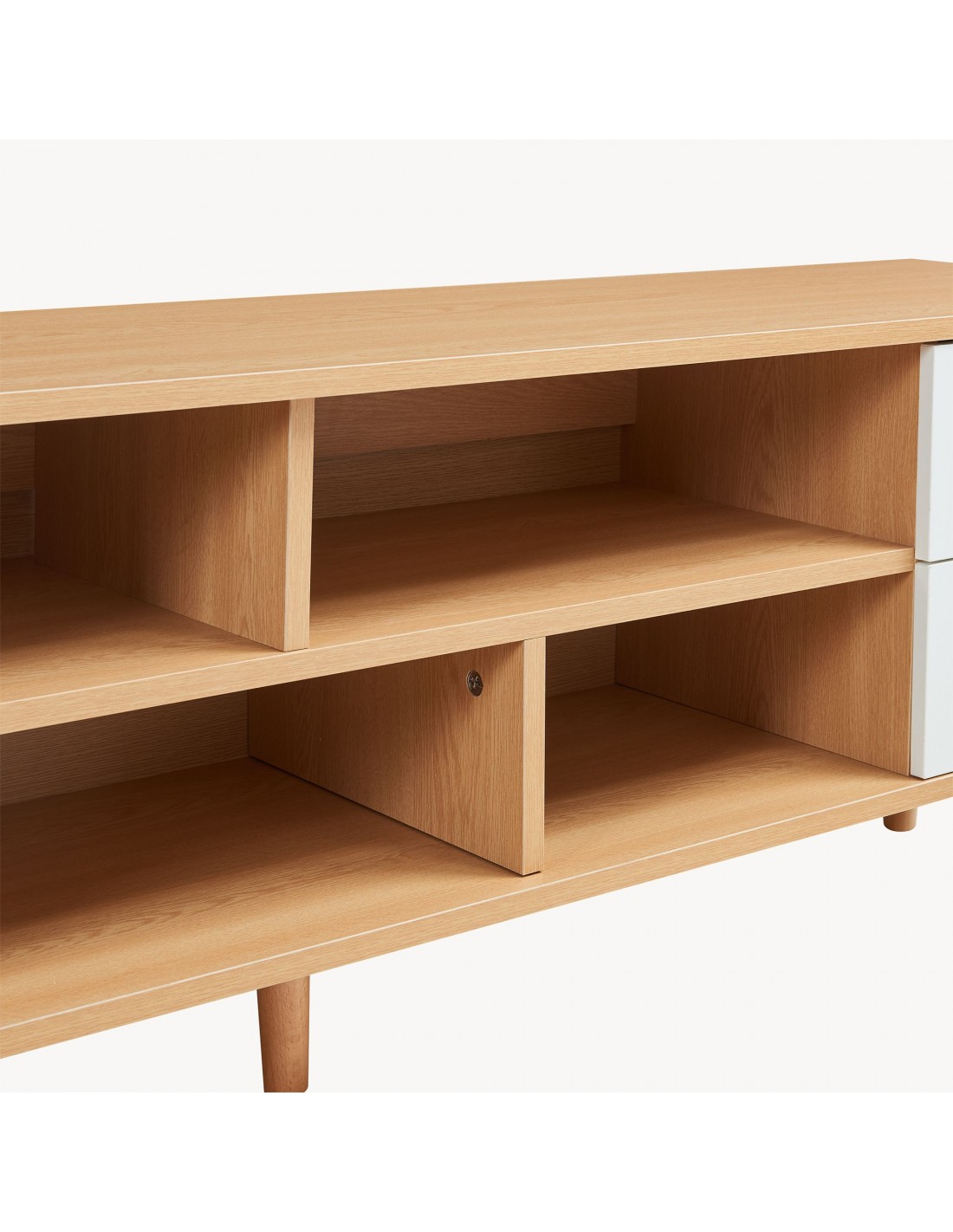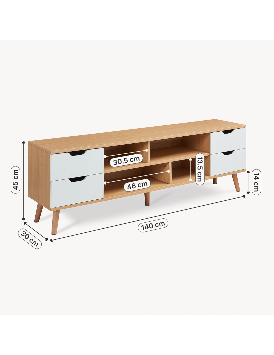 Tvbord udført i et moderne og Skandinavisk design af hvid- og naturfarvet gummitræ og møbelplade. Tvbordet har 4 åbne hylderum og 4 skuffer og måler 45 cm i højden og 140 x 30 cm i bredde og dybde.