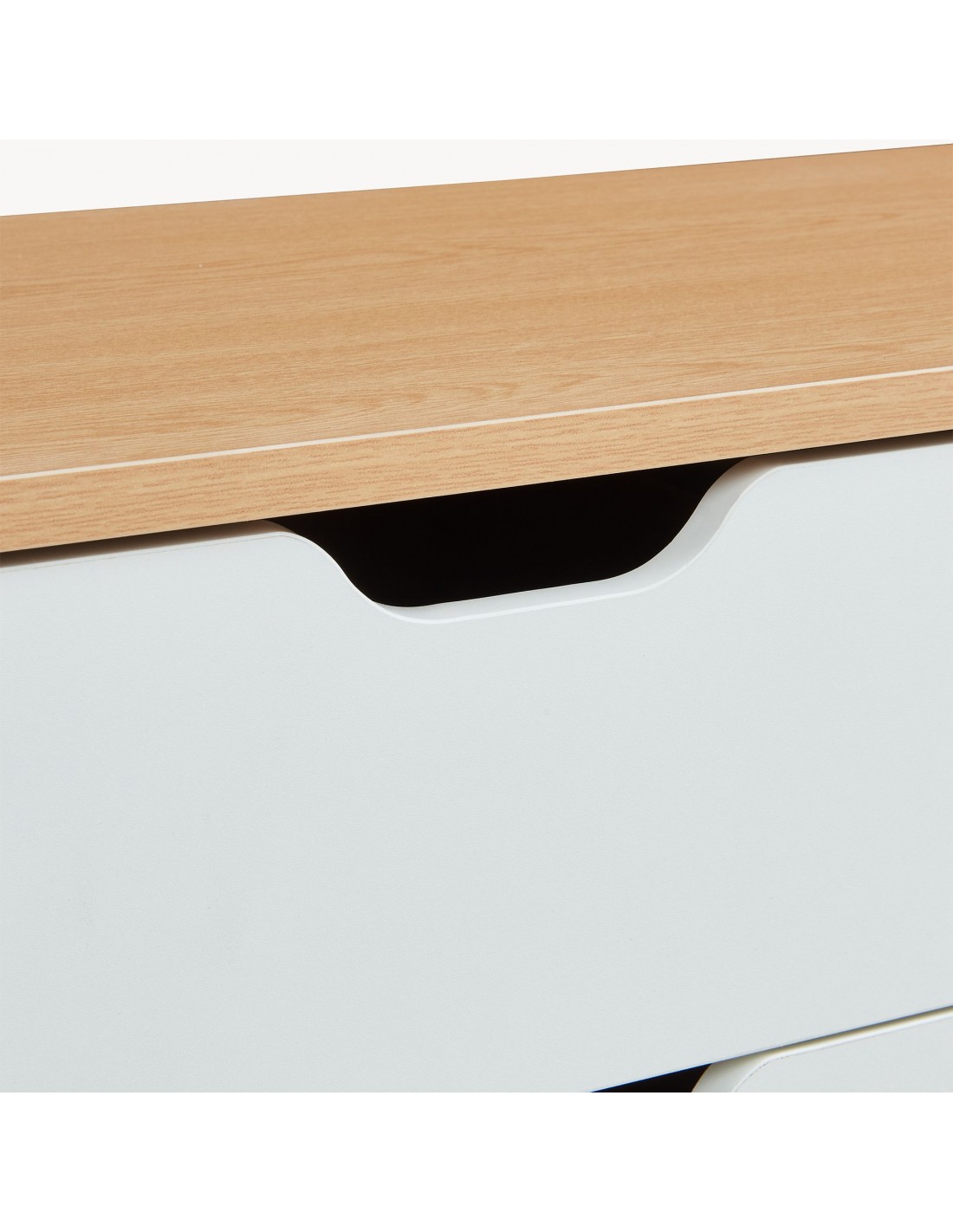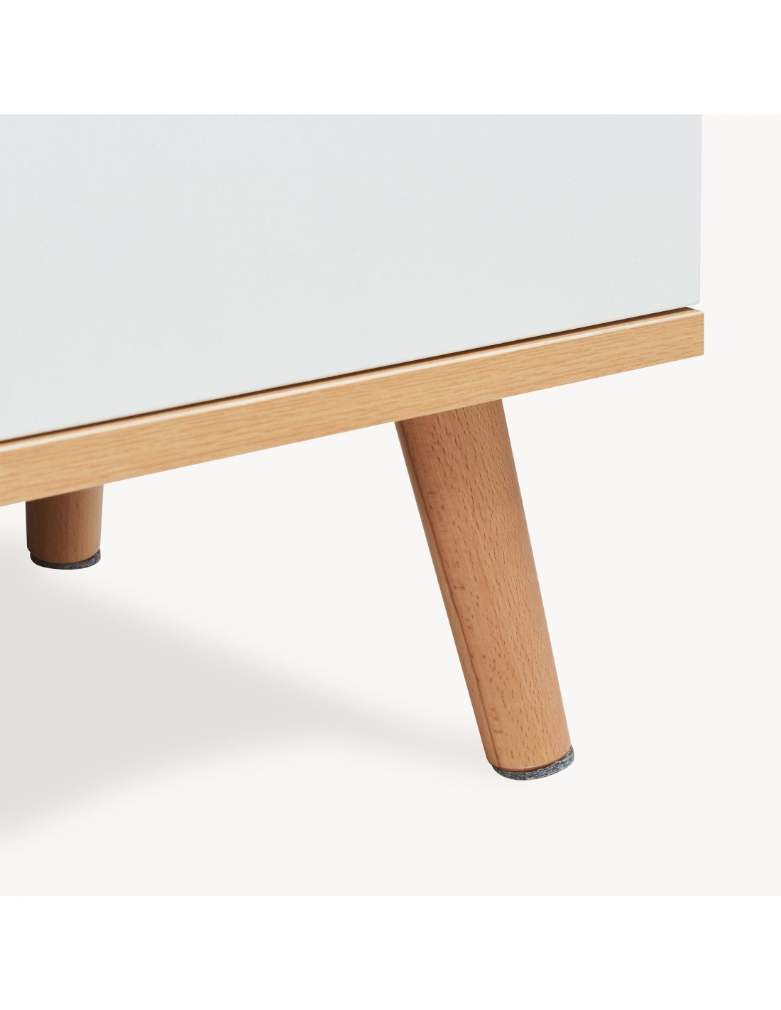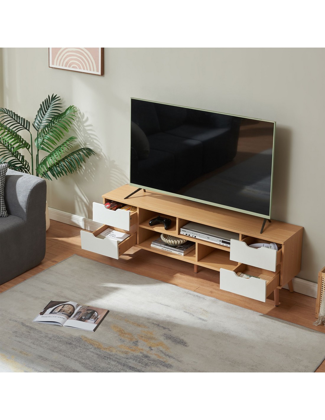 Tvbord udført i et moderne og Skandinavisk design af hvid- og naturfarvet gummitræ og møbelplade. Tvbordet har 4 åbne hylderum og 4 skuffer og måler 45 cm i højden og 140 x 30 cm i bredde og dybde.