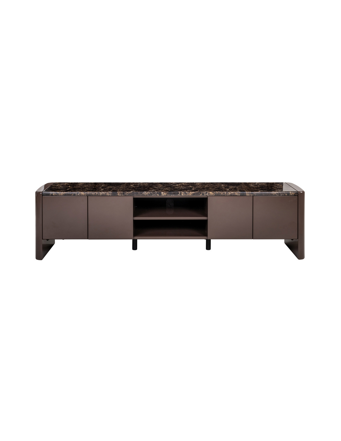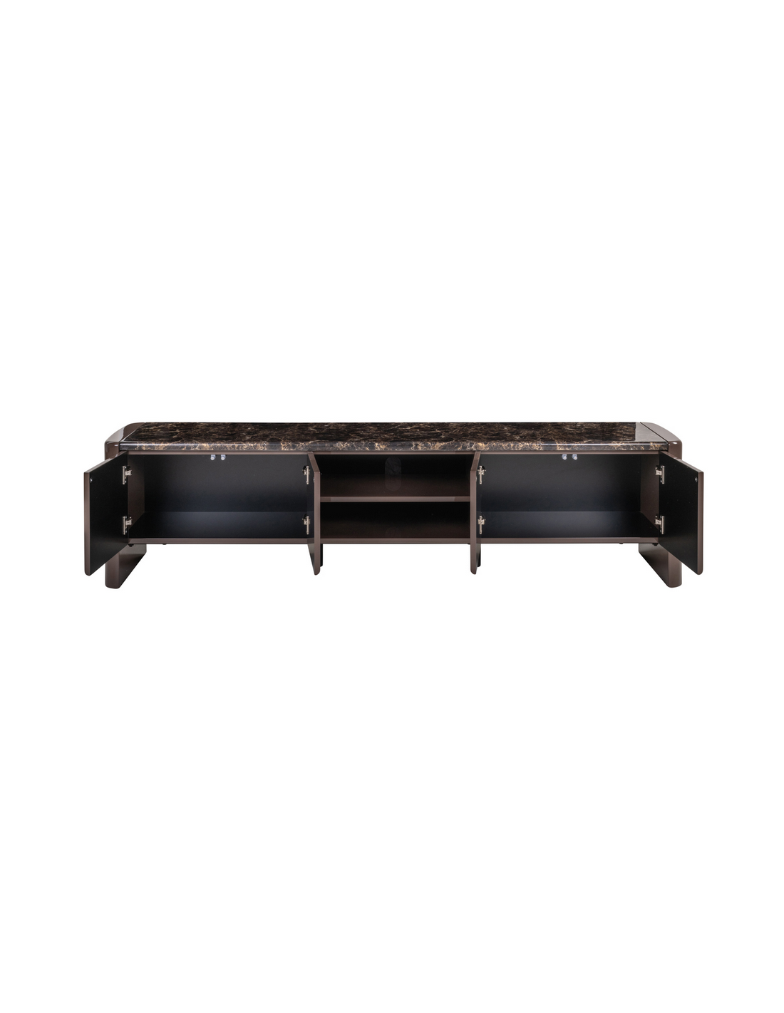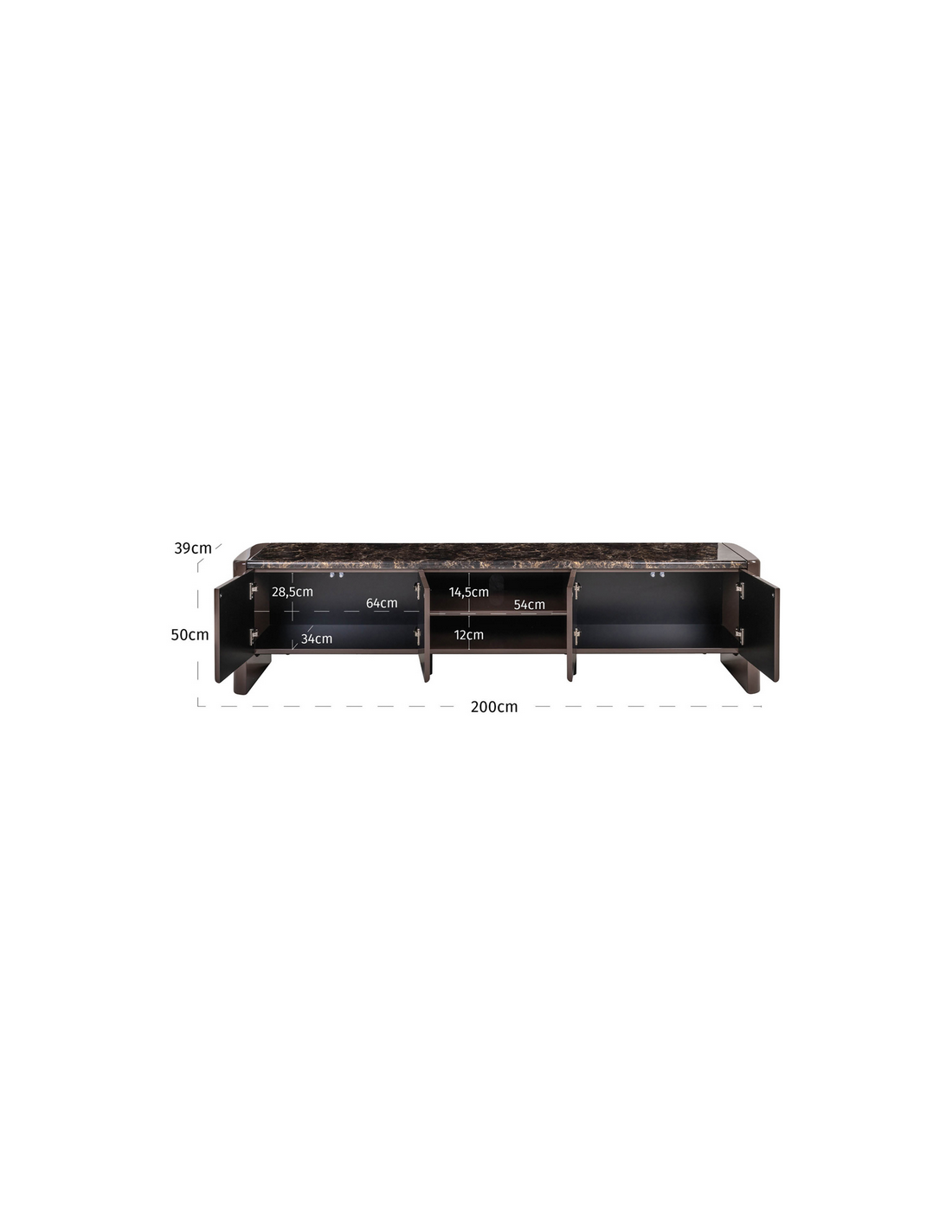ALMUNDI Tvbord fra hollandske Richmond Interiors, udført i et design af brunlakeret MDF og med topplade i keramik i brunt marmorlook. Tvbordet måler 50 cm i højden og 200 x 39 cm i bredde og dybde. I tvbordet forefindes 2 åbne hylderum samt i alt 4 skabslåger med push-to-open funktion.