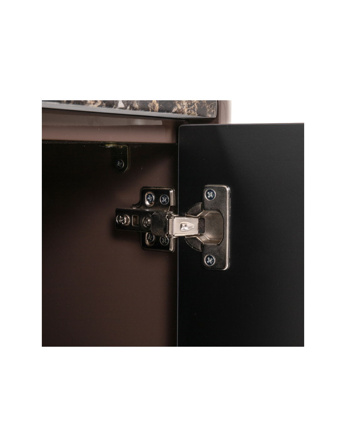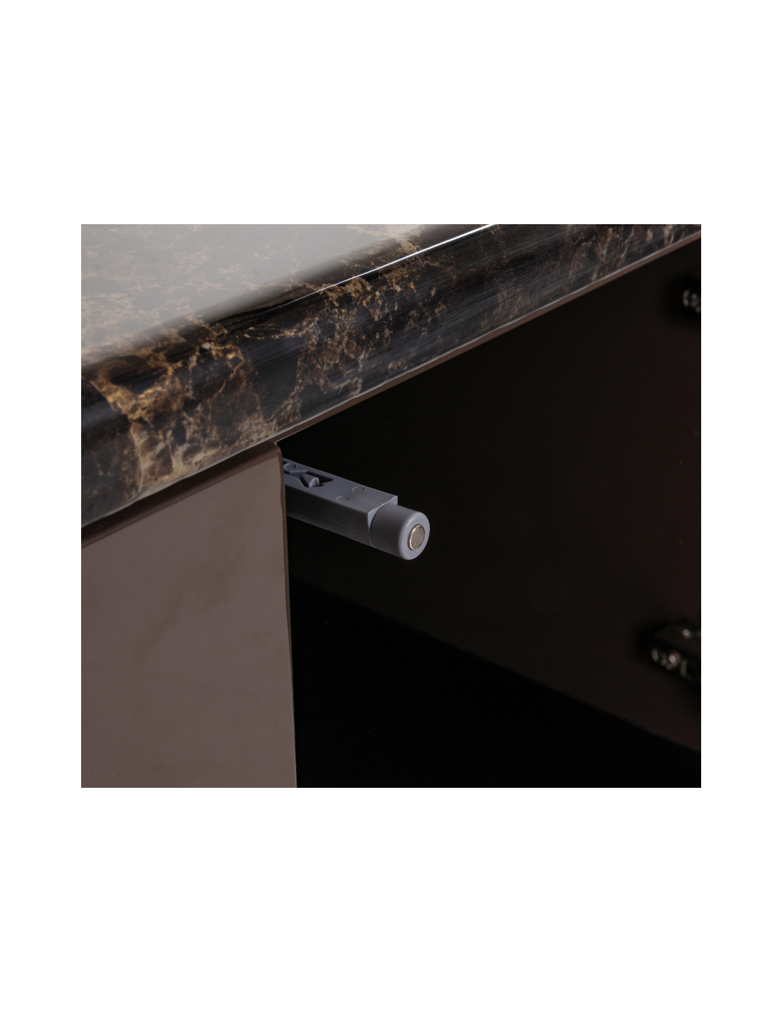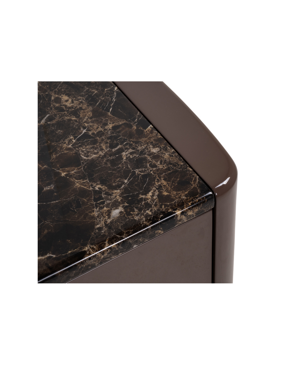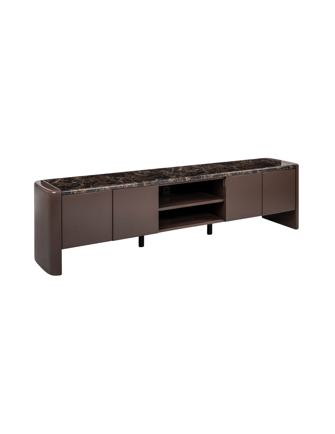 ALMUNDI Tvbord fra hollandske Richmond Interiors, udført i et design af brunlakeret MDF og med topplade i keramik i brunt marmorlook. Tvbordet måler 50 cm i højden og 200 x 39 cm i bredde og dybde. I tvbordet forefindes 2 åbne hylderum samt i alt 4 skabslåger med push-to-open funktion.