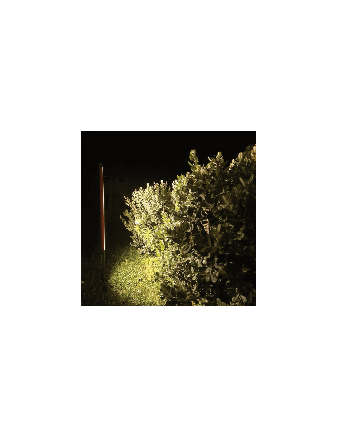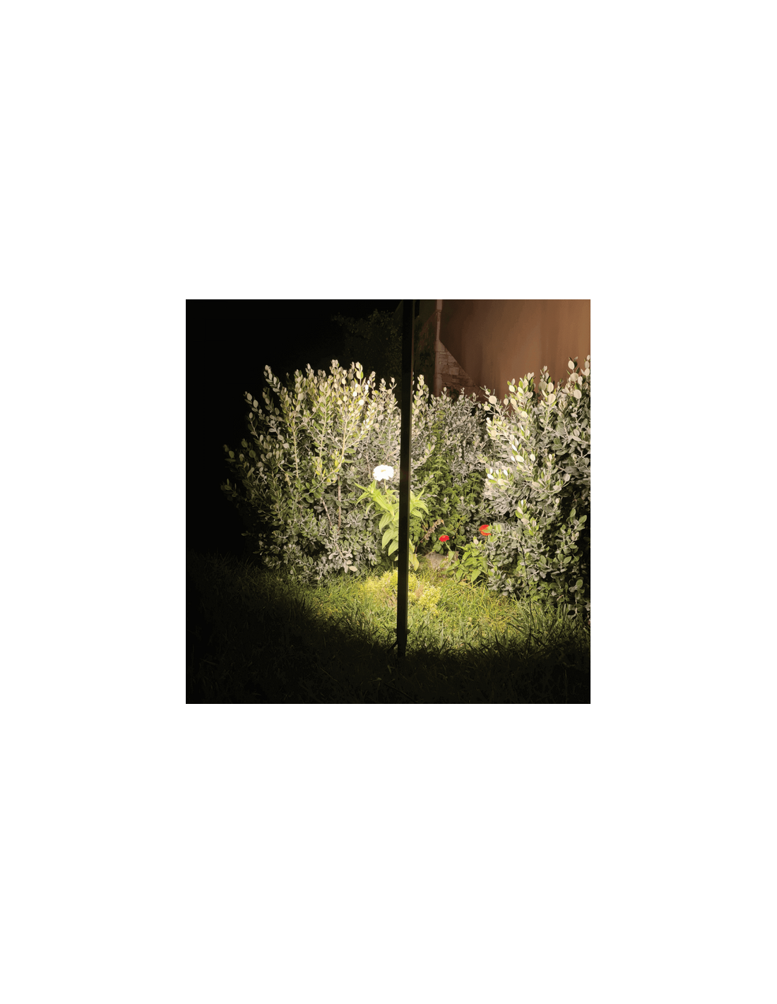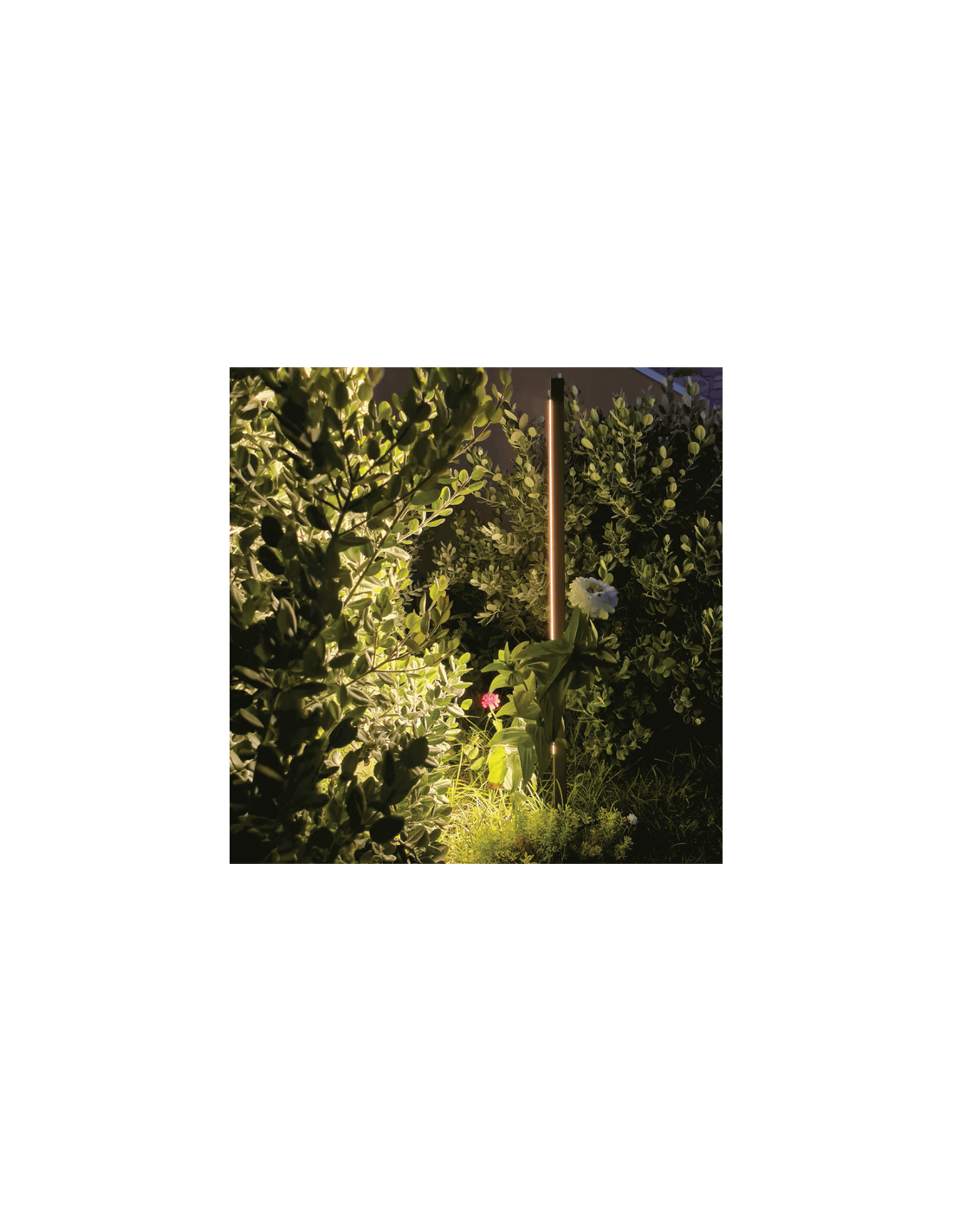 Udendørs bedlampe udført i et moderne design fremstillet i mat mørkebrun lakeret aluminium og hvid polycarbonat. Lampen måler 74 cm i højden + spyd og anvender 15W LED lyskilde (Inkl.).