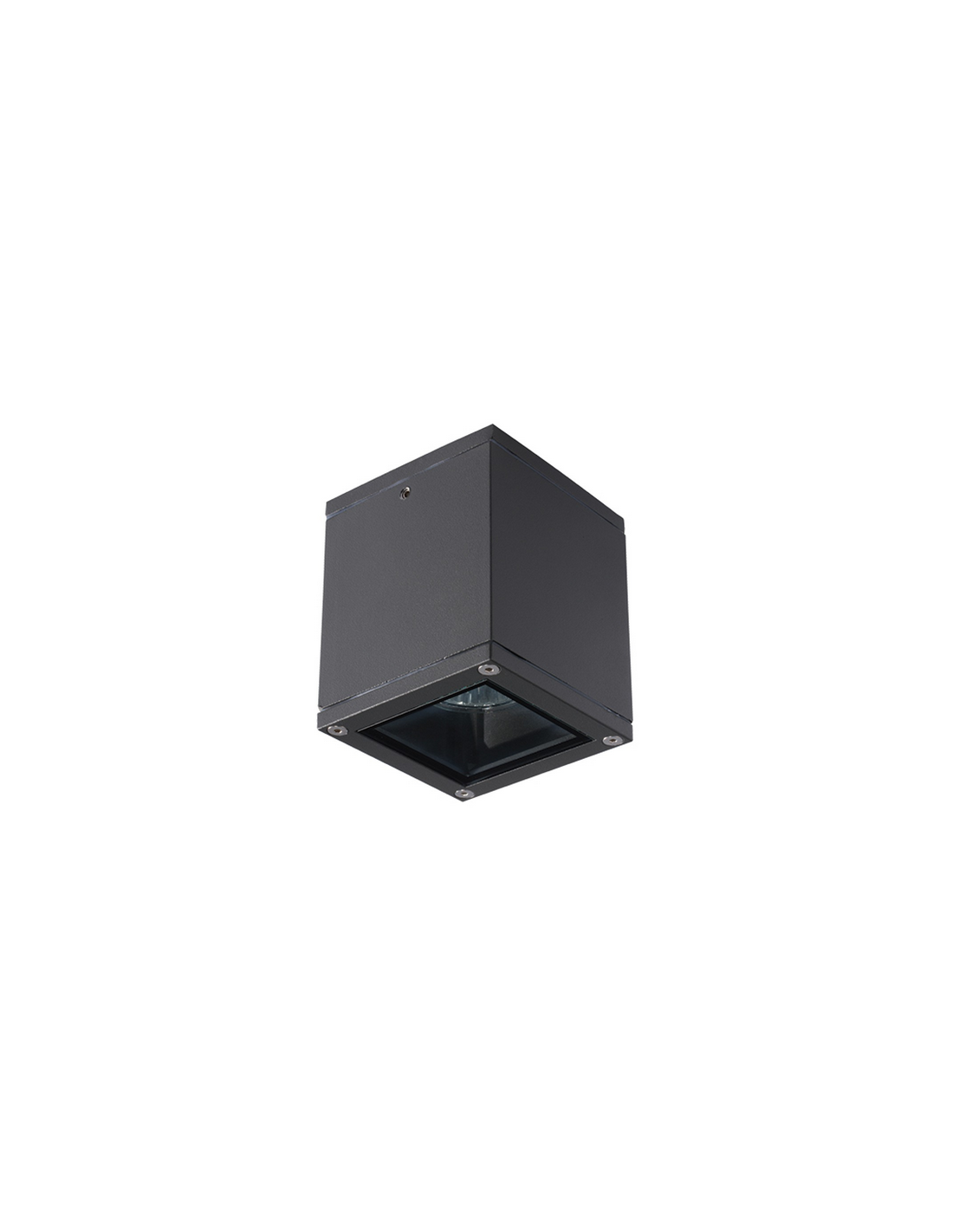 Udendørs påbygningsspot udført i et design af mat graphitgrå lakeret aluminium og klart glas. Lampen måler 8,5 x 8,5 cm i bredde og dybde og anvender 1 x GU10 lyskilde (Ekskl.).