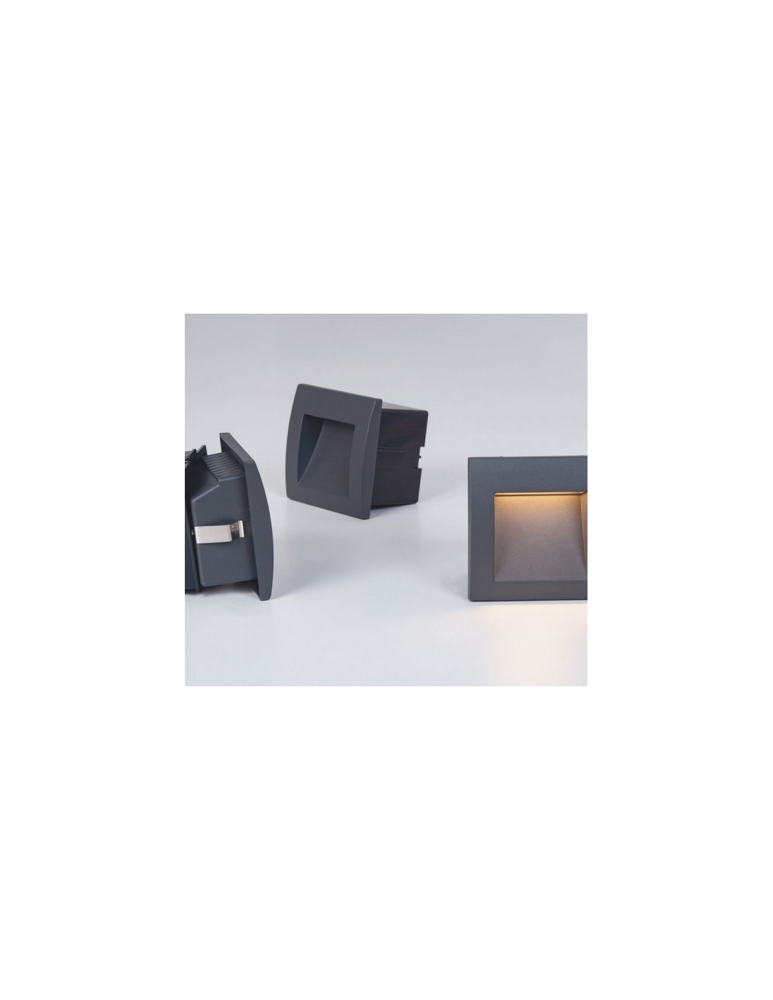 Udendørs væglampe til indbygning, udført i et moderne design af satineret graphitgrå lakeret aluminium og hvid polycarbonat. Lampen kommer med 2W LED lyskilde. Lampen måler 9 x 9 cm i højde og bredde (frontmål).