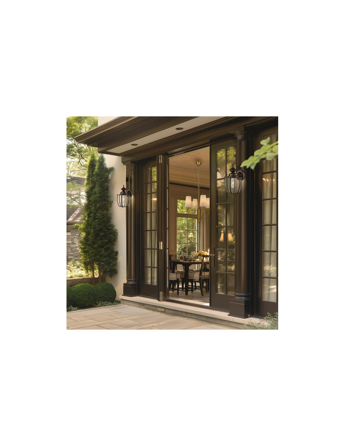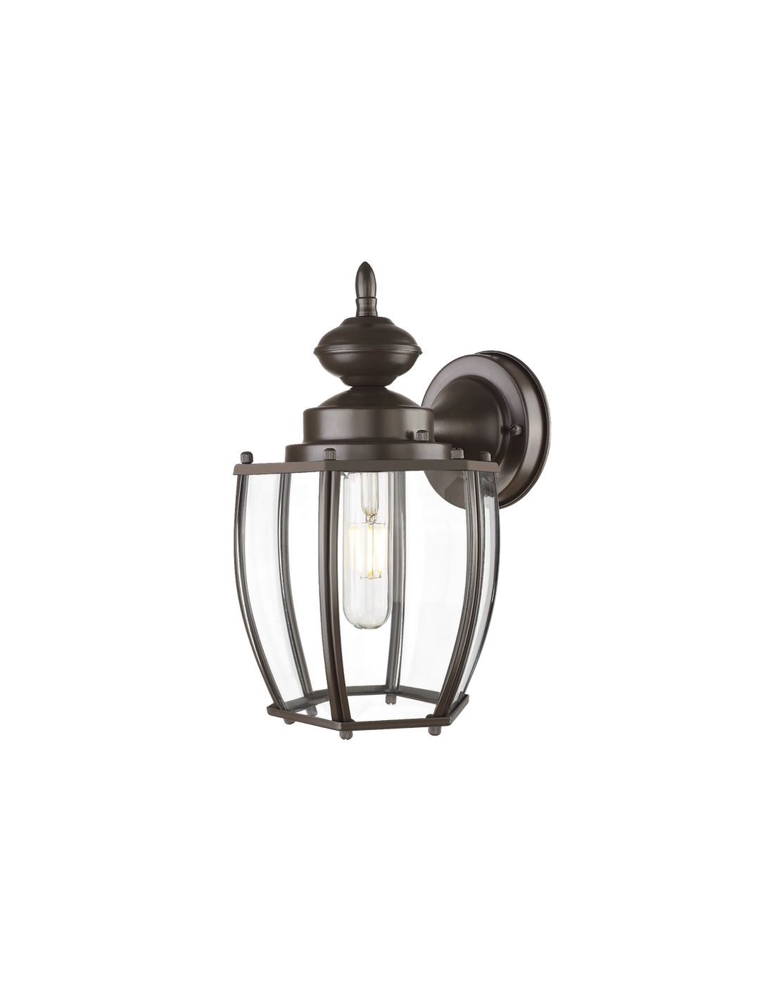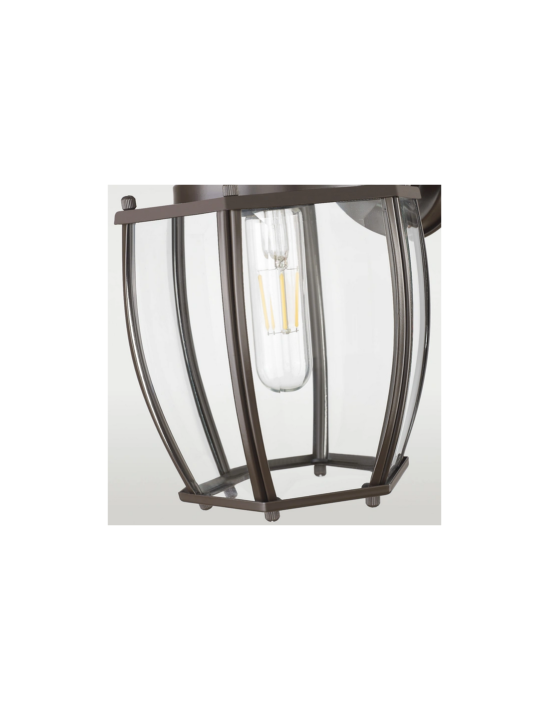 NUUK Udendørs væglampe udført i et design af brunlakeret aluminium og klart glas. Lampen leveres til europæisk standard til 1 x E27 lyskilde og måler 30,5 cm i højden og 18 x 20 cm i bredde og dybde/fremspring.
