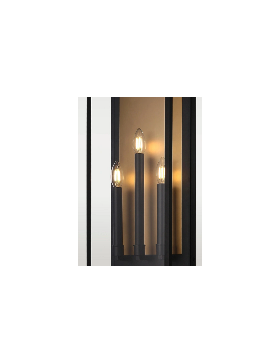 MALIBU Udendørs væglampe udført i et design af sortlakeret aluminium med detalje i messinglakeret aluminium, og skærm i klart glas. Lampen leveres til europæisk standard til 3 x E14 lyskilder og måler 76,3 cm i højden og 29 x 14 cm i bredde og dybde/fremspring.