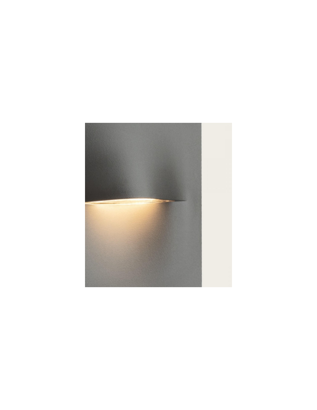 Udendørs væglampe udført i et moderne design fremstillet i satineret graphitgrå lakeret aluminium og klart polycarbonat. Væglampen måler 14 x 14 cm i højde og bredde og anvender 3W LED lyskilde (Inkl.).