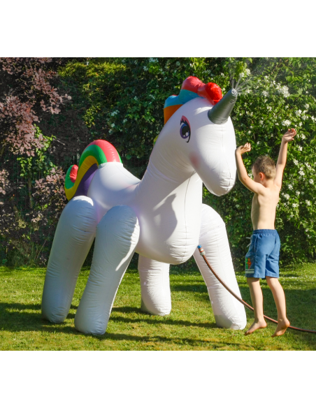 Oppustelig enhjørning med vandspreder, udført i et design af hvid og regnbuefarvet PVC. Enhjørningen måler 211 cm i højden og 284 x 127 cm i bredde og dybde. Der medfølger reparationssæt til enhjørningen. Pust enhjørningen op, kobl haveslangen til og se dine børn hygge sig.