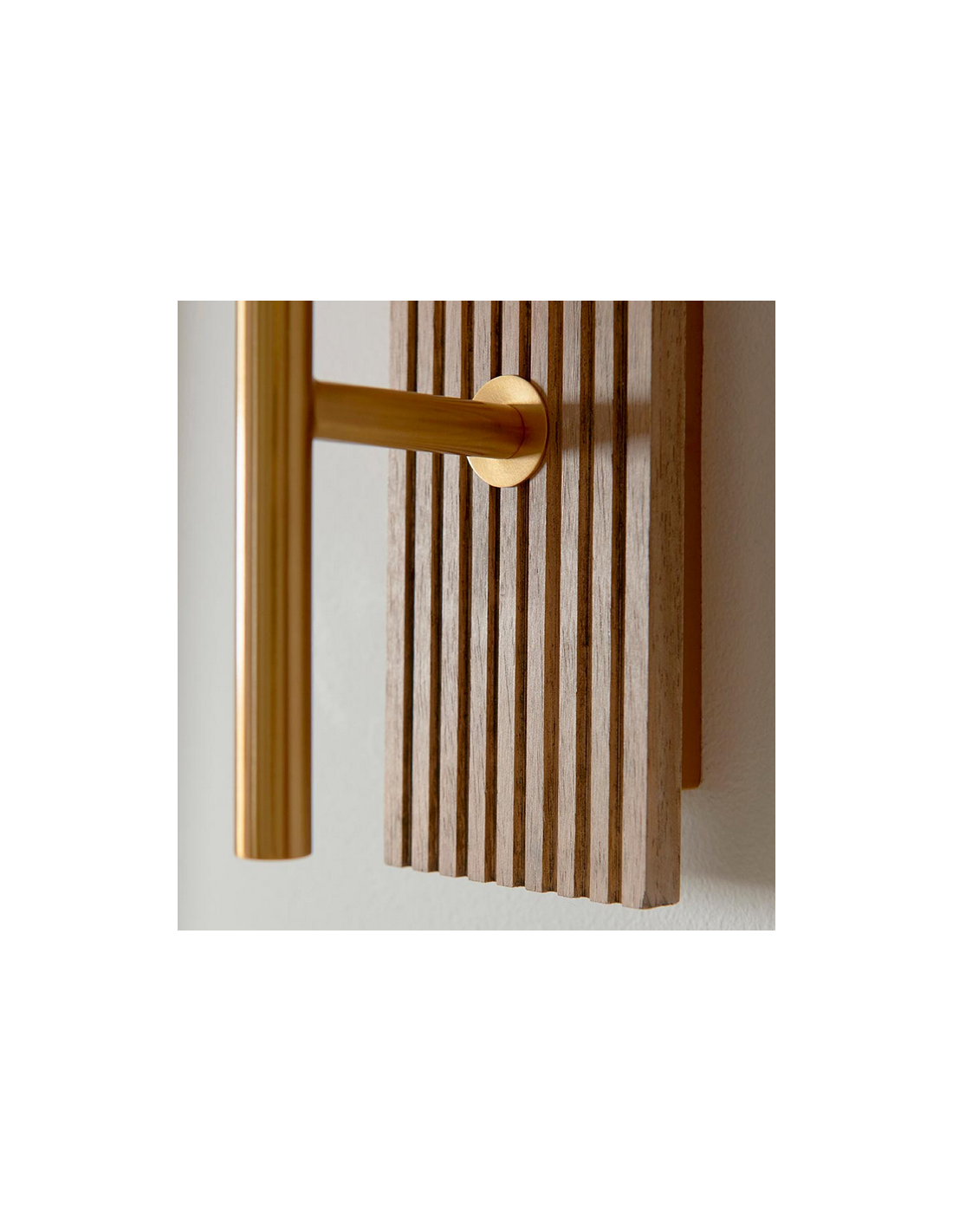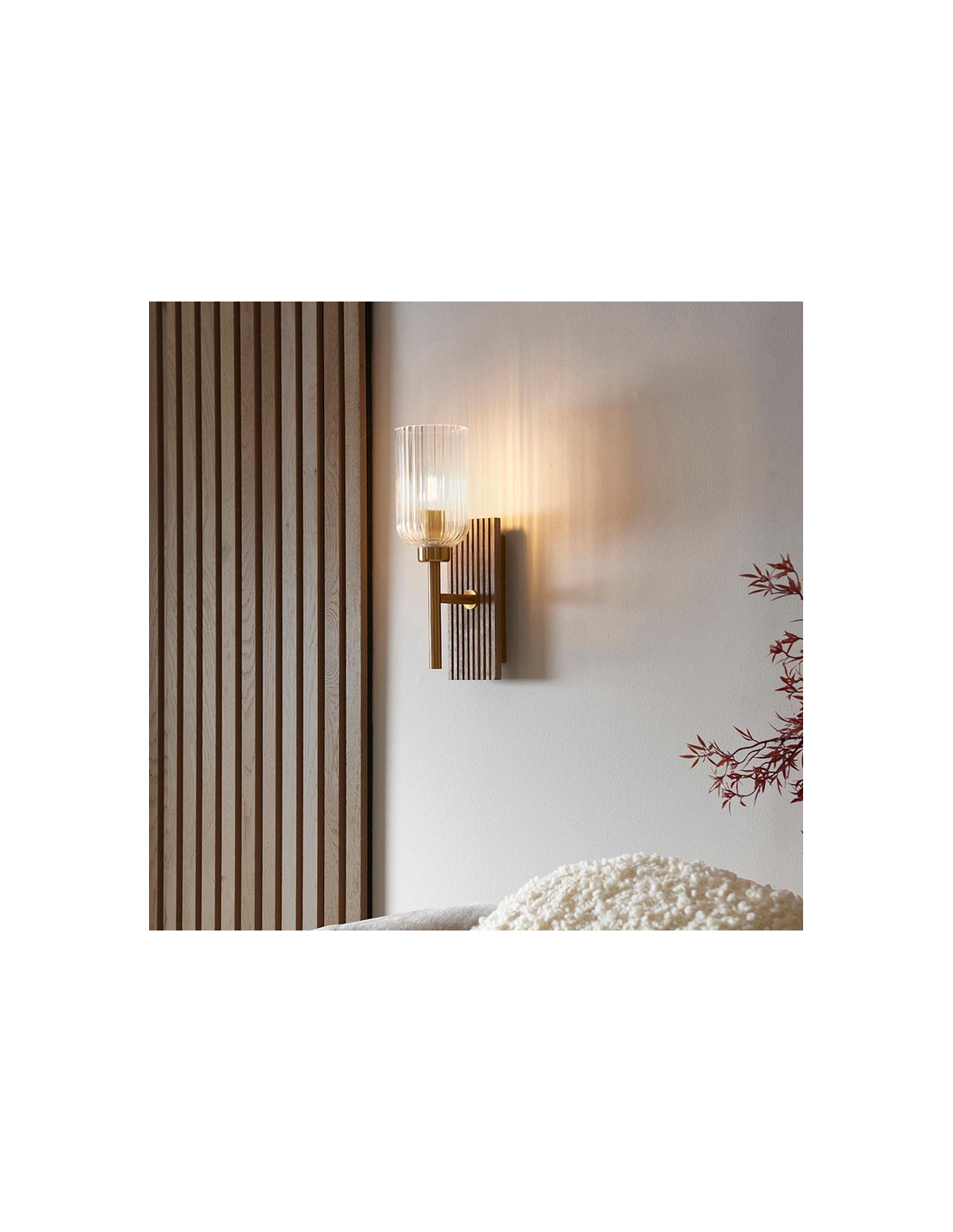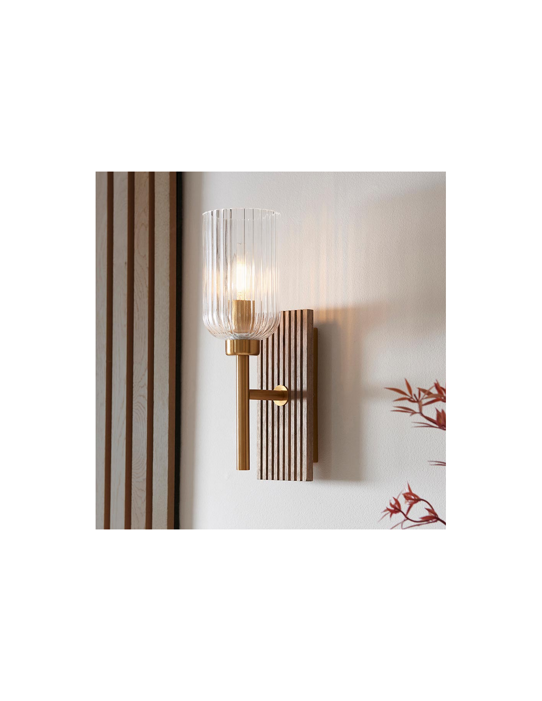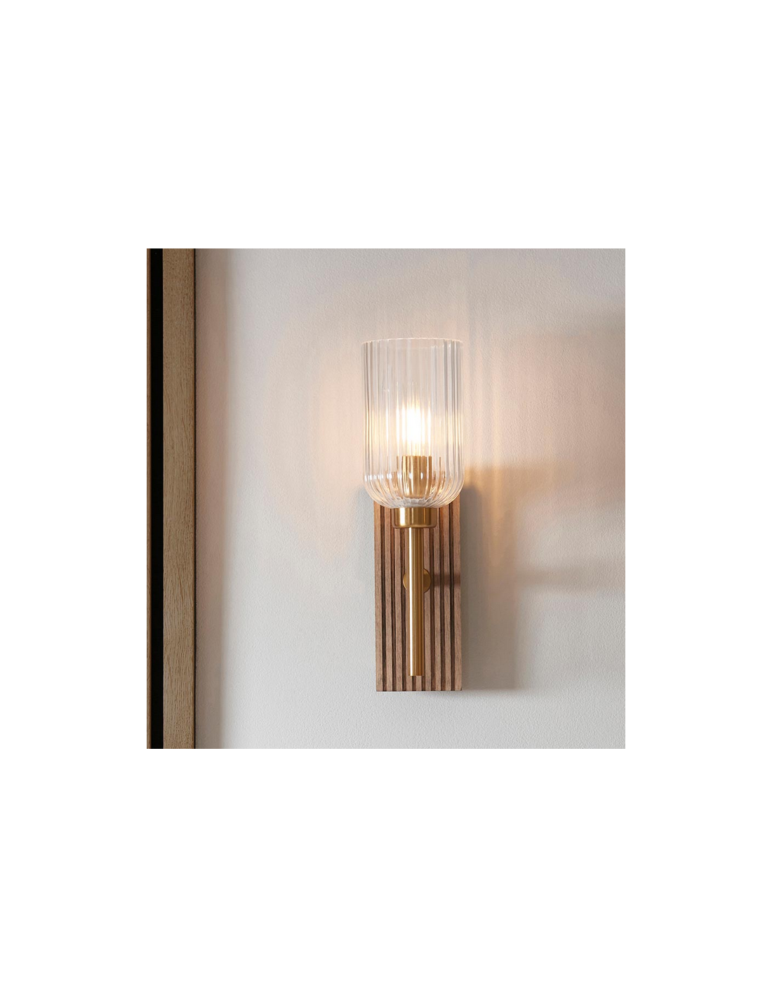 GROVE Væglampe i bøgetræ, stål og glas H29,5 cm 1 x E14 - Antik messing/Brun bøg/Klar rillet