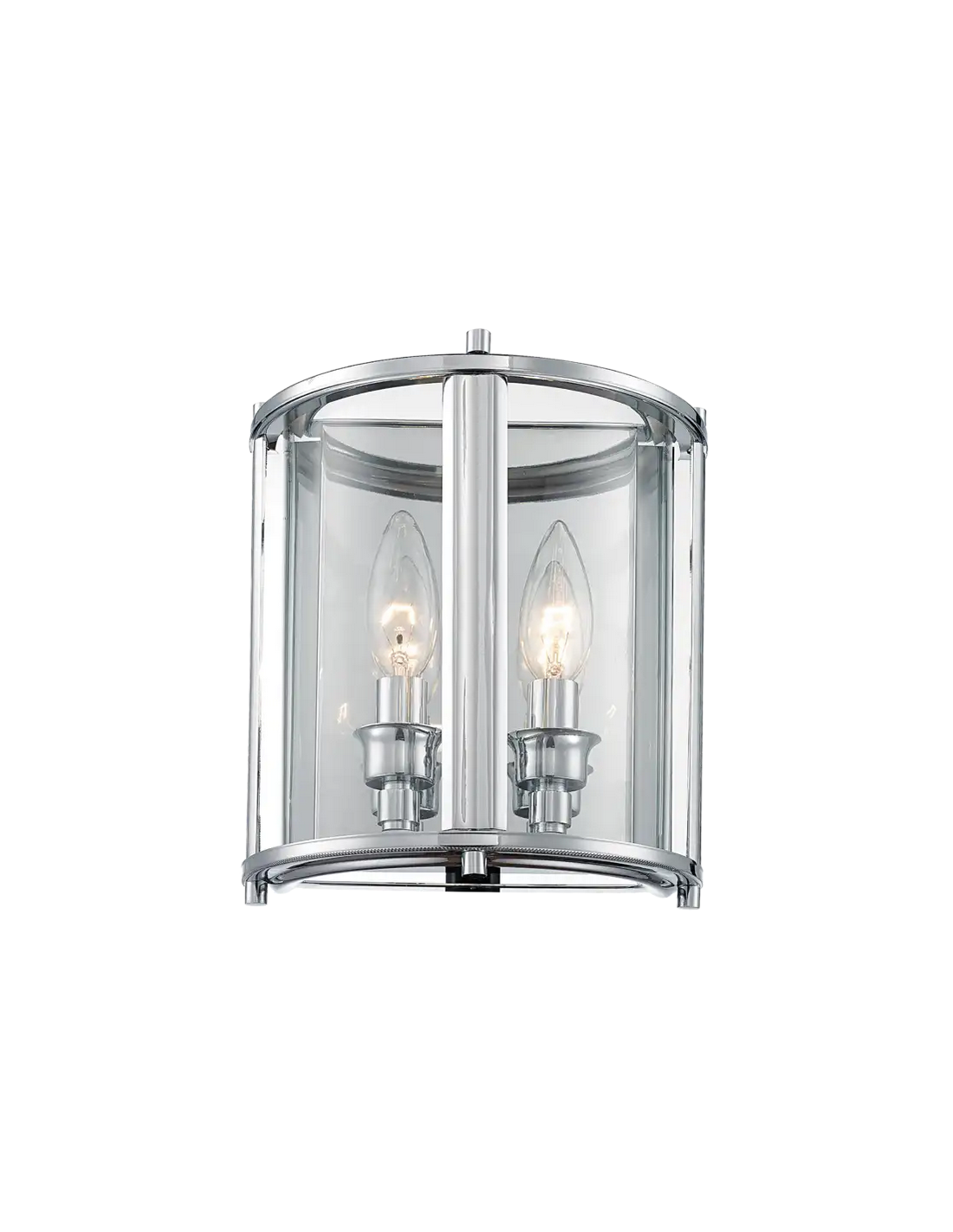 NEW YORK Væglampe fremstillet i et design af kromlakeret metal og klart glas. Lampen måler 23 cm i højden og leveres til europæisk standard til 2 x E14 lyskilder.