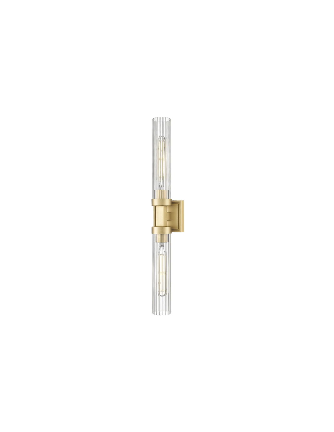 QUINCY Væglampe fremstillet i et design af børstet messinglakeret metal og klart rillet glas. Lampen måler 69 cm i højden og leveres til europæisk standard til 2 x E27 lyskilder (Edison lyskilder kan med fordel anvendes).