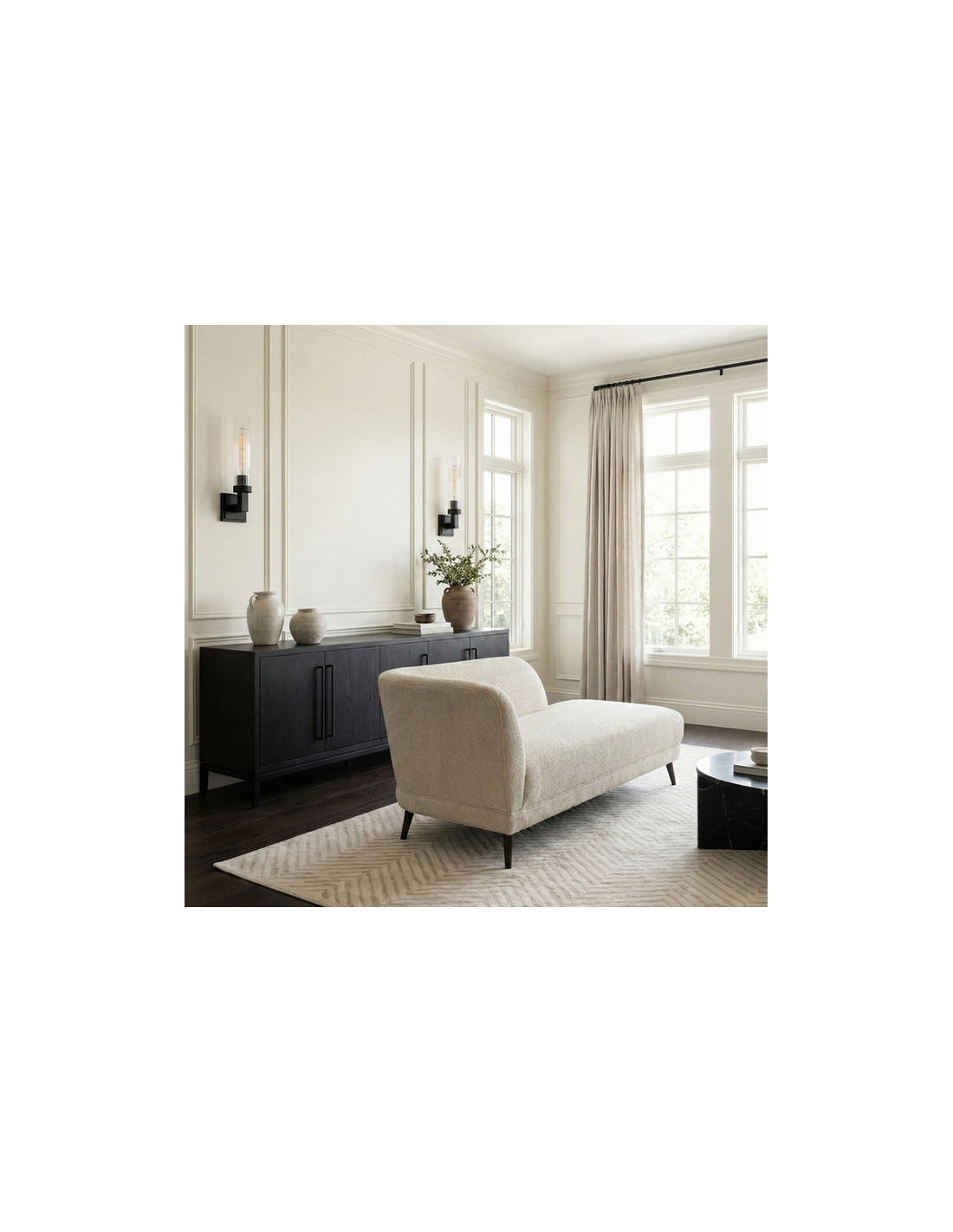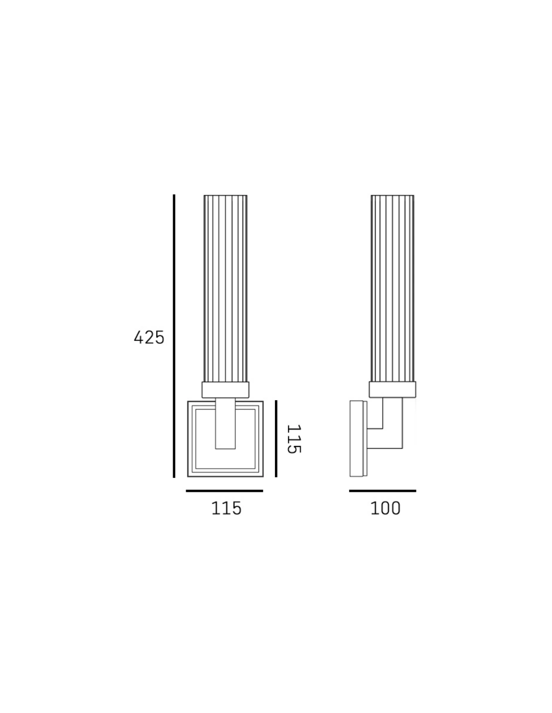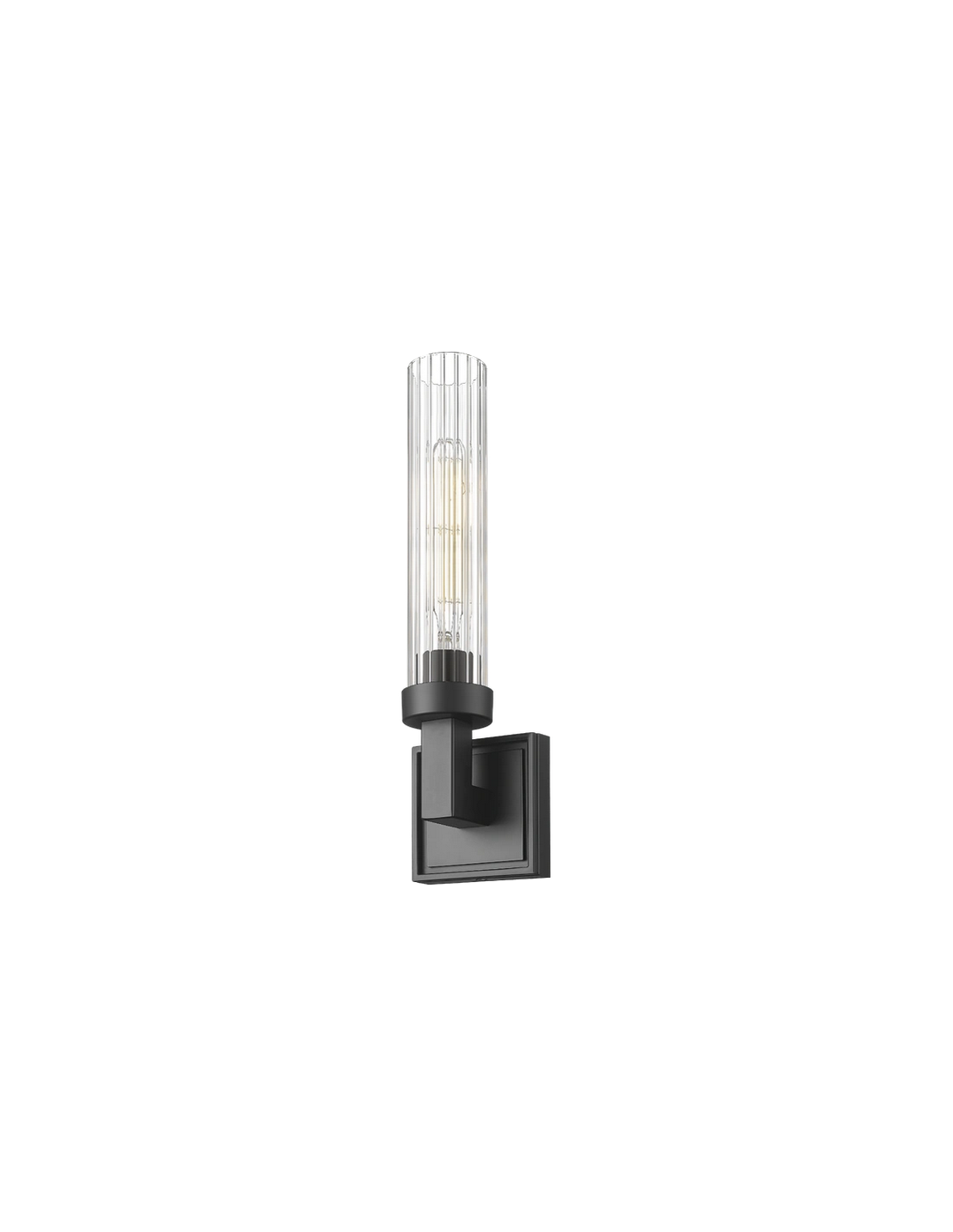 QUINCY Væglampe fremstillet i et design af sortlakeret metal og klart rillet glas. Lampen måler 42,5 cm i højden og leveres til europæisk standard til 1 x E27 lyskilde (Edison lyskilder kan med fordel anvendes).
