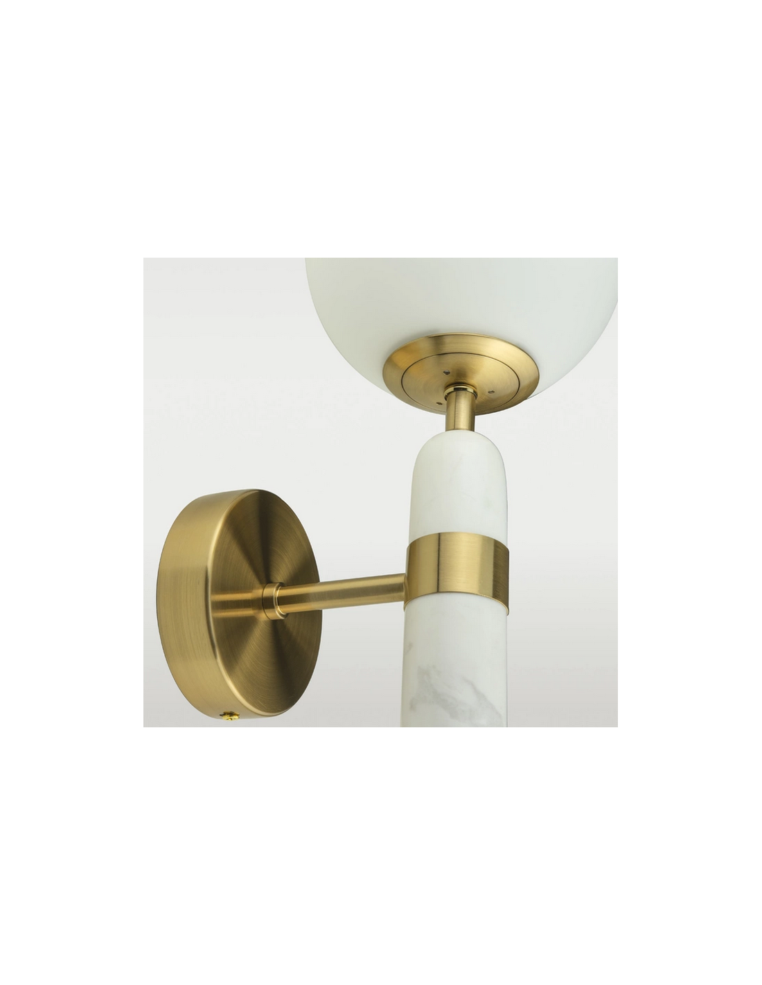 LA SPEZIA Væglampe fremstillet i et design af hvid marmor, børstet messinglakeret metal og hvid opalglas. Lampen måler 34 cm i højden og leveres til europæisk standard til 1 x E14 lyskilde.
