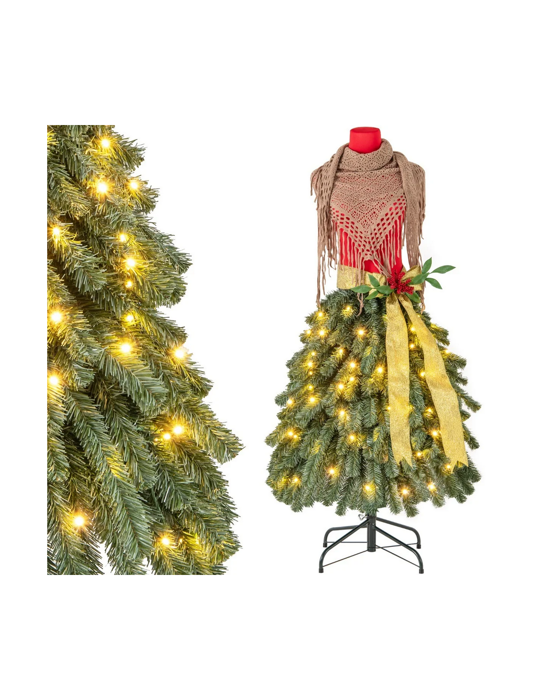 Jule gine med 100 led lys i kjolen, udført i rød- og grøn kunststof. Figuren tåler kun anvendelse indendørs og kommer med ledning på 150 cm.
